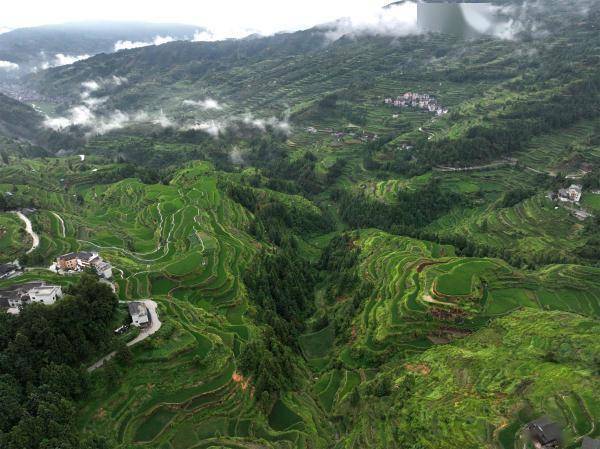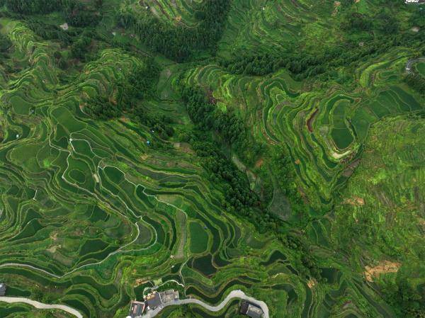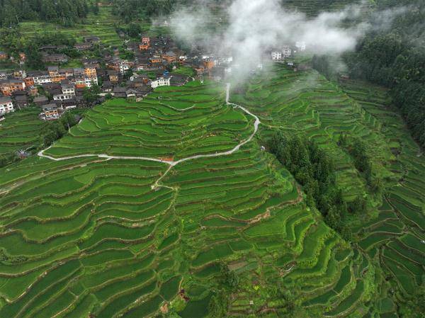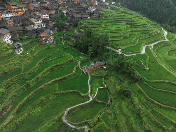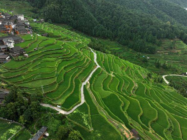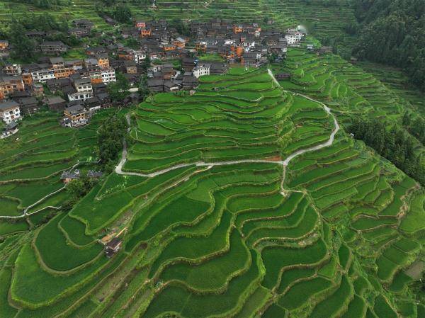 盛夏时节,贵州省黔东南苗族侗族自治州黎平县肇兴镇堂安村层层叠叠的梯田与青山、村落共同描绘出了一幅美丽的田野画卷。(宁坚吴光辉)