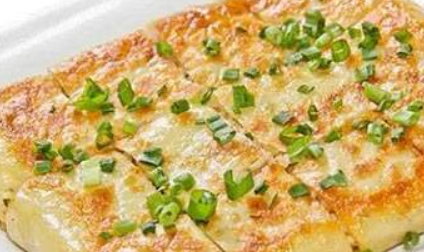 8.将稍大一些的大于豆皮的盘子或其他容器扣在整个豆皮上,然后把锅反过来,装盘,切成4cm为边长的方块,再分盘,撒上葱花即可。