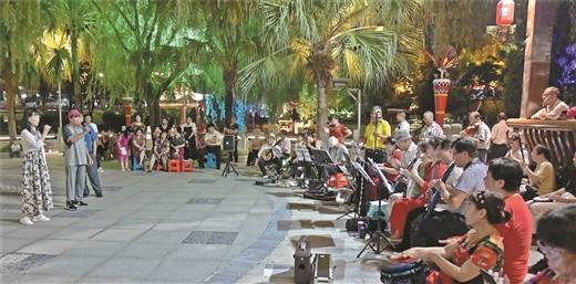 8月1日晚,在山水瑶城景区漫步的游客与当地老年音乐爱好者共享欢乐。