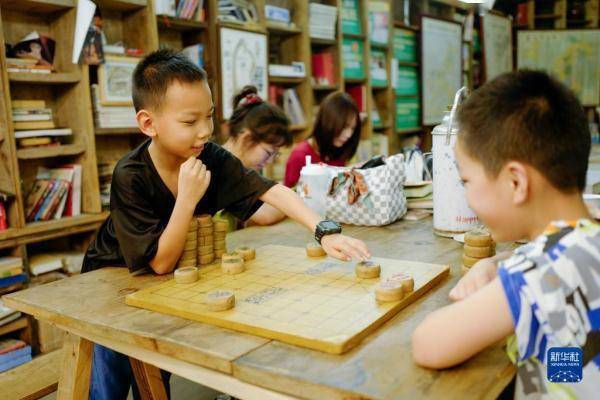 8月2日,两个男孩在重庆市九龙坡区黄桷坪街道的一家书屋下棋。