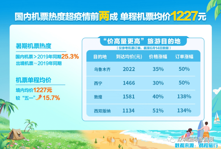 携程数据显示,截至6月14日,暑期到达乌鲁木齐机票均价为2022元,较2019年同期增长35%,预订量已经超过2019年同期50%;到达西宁机票均价为1466元,较2019年同期增长30%,预订量超过2019年同期50%;到达敦煌机票均价为1581元,较2019年同期增长40%,预订量超过2019年同期138%。暑期到达西双版纳机票均价为1134元,较2019年同期增长51%,预订量超过2019年同期134%。