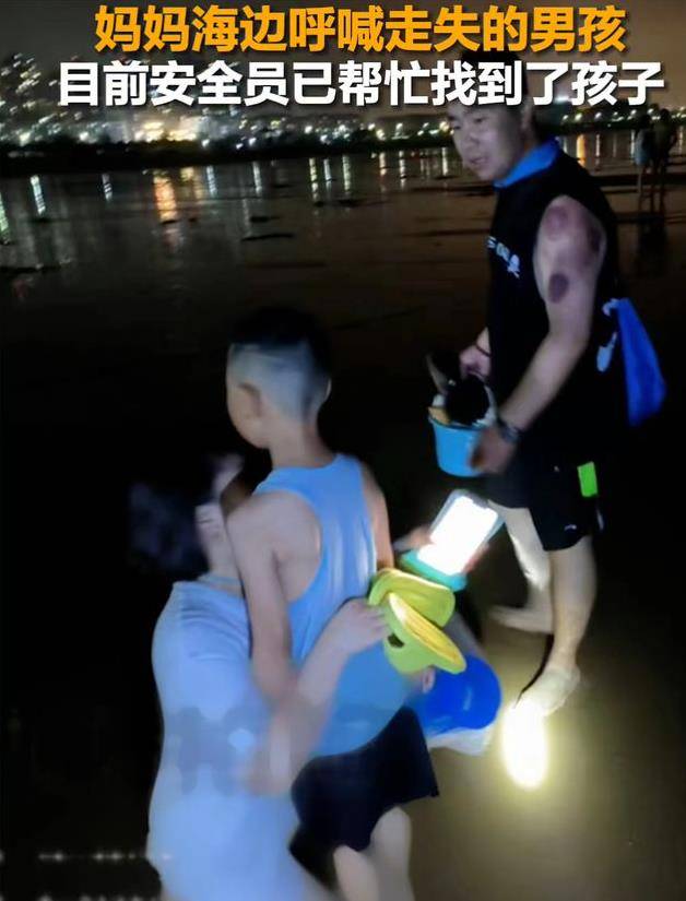 原来,当晚孩子在沙滩上玩得过于兴奋,不停地走动,玩着玩着才发现找不到妈妈了。当发现自己走丢后,这个小男孩虽然着急,但也非常沉着冷静,他找到了沙滩上穿制服的安全员,请求他帮忙找妈妈。所幸地是,十几分钟后,安全员帮孩子找到了妈妈。