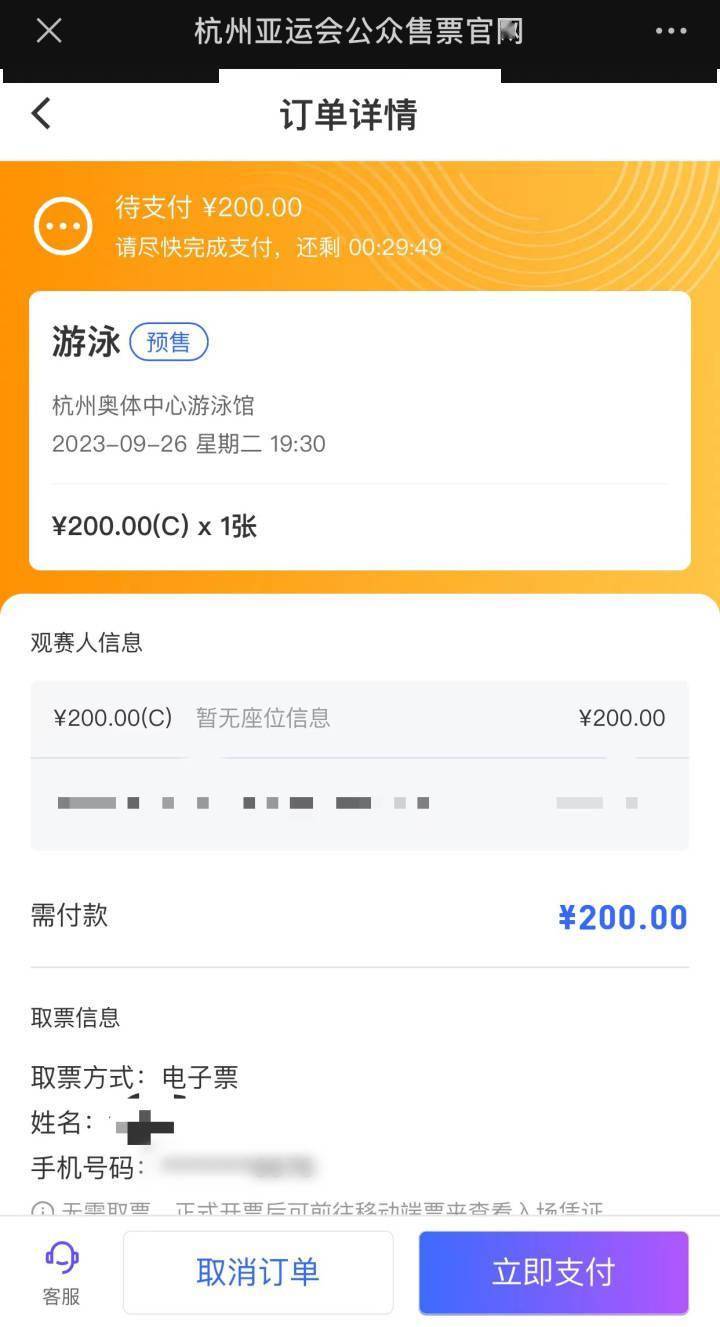 夏青抢到的亚运游泳项目的门票订单
