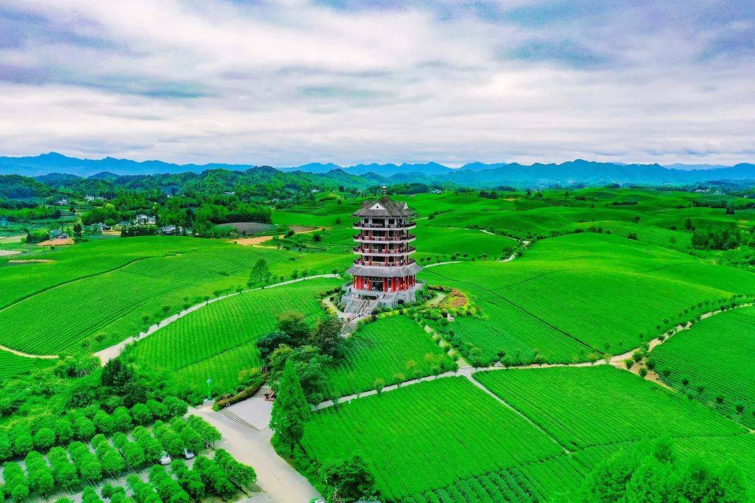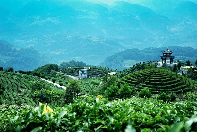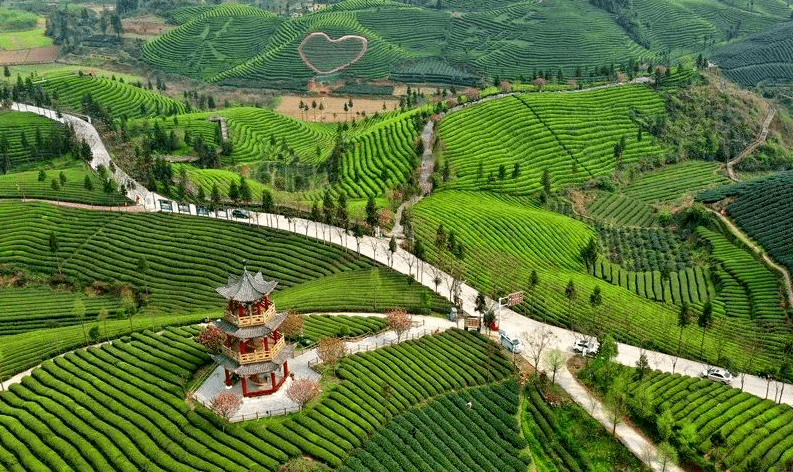 ▲仡山茶海--春日照耀下,站在“茶圣亭”放眼望去,茶园堆青叠翠,垄垄茶树依山顺势,绿野遍坡。