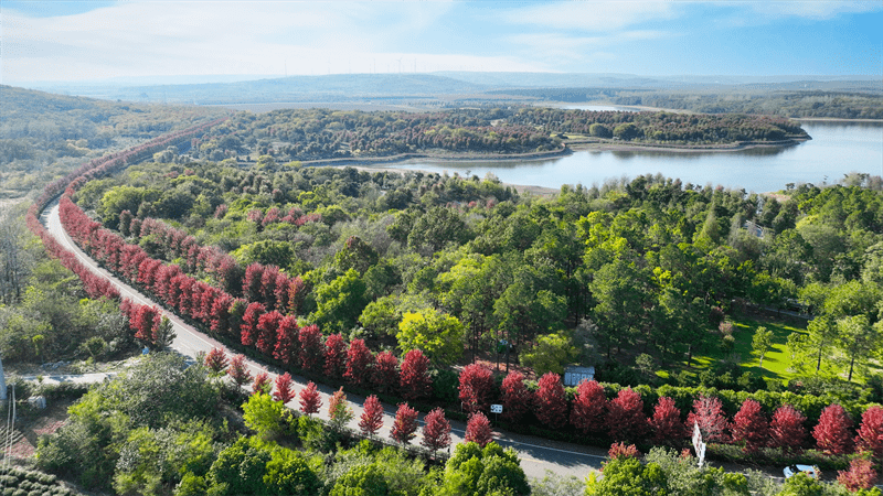 大泉之美,在于俯拾皆是、处处生动的细节。春有花、夏有景、秋有果、冬有绿,四时之景不同,而乐亦无穷也。竹镇镇作为六合西北部最美的旅游目的地,是六合区全域旅游的一个重要板块,以大泉湖—止马岭为核心的休闲旅游度假区山水相连、植被繁茂,山、水、林、禽同生,一幅奇特的大自然和谐趣图跃然而出。枫彩漫城、金陵国卉牡丹园、止马岭、池杉林、大泉人家康养民宿等景区串珠成线,散落在这最美的大泉村里,外围还有果子王生态农庄、竹镇抗日民主政府旧址等特色景区景点,同时还有47平方公里连片的经济林果和彩叶苗木环绕周围,连续多年打造的大地花海景观,形成了百株玉兰、百株樱花、百亩牡丹、千亩玫瑰花海、万亩桃花。整片土地生机勃勃,是名副其实的天然“氧吧”。