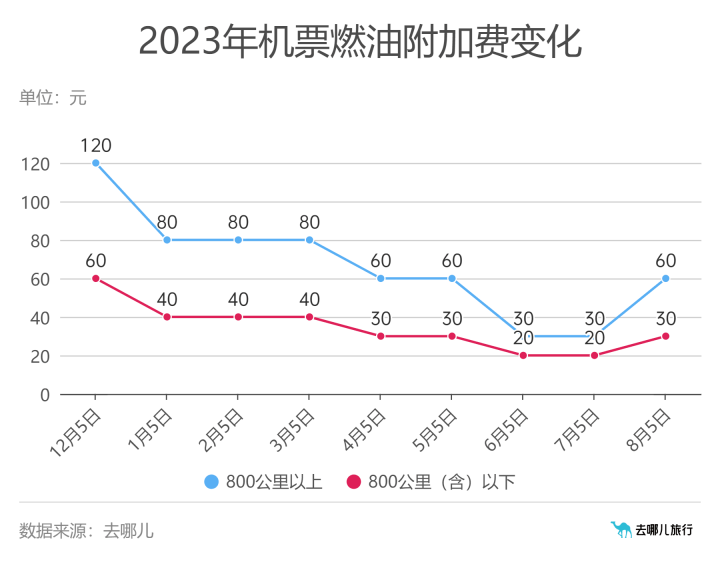 此次调整为2023年以来燃油附加费首次上涨,较上月涨了10/30元,但与年初的60/120元相比,依然较低。在燃油附加费征收标准调整(8月5日)前,燃油附加费仍为20/30元,有出游需求的旅客可尽快购票。