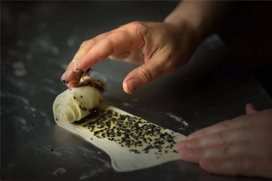 油酥,是火烧的点睛之笔。驴油、花生油与面粉混合熬制。卷进面剂,等待高温催化出浓郁的香气。