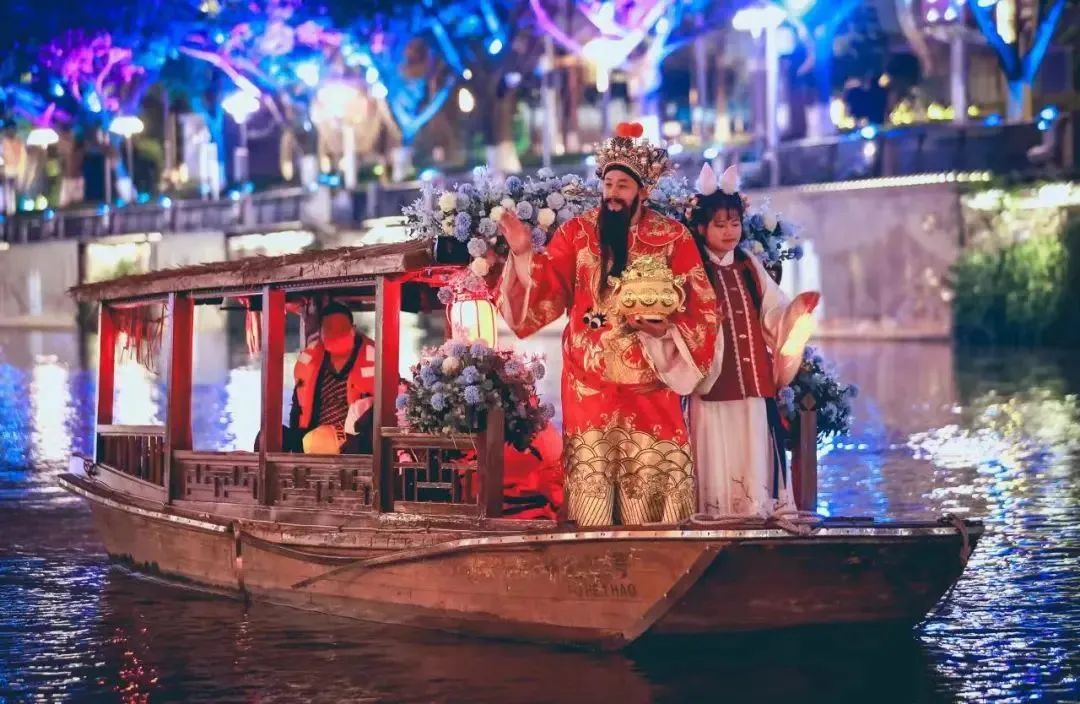 在东门码头,游客们不仅可以在国潮雅市上体验画扇、拓印、捏泥人、画糖人等传统娱乐项目。游客还可以从码头盛装登船,近距离观赏两岸精彩演出,包括文君相如的爱情故事、音乐码头的灯笼阵、帆船秀等。
