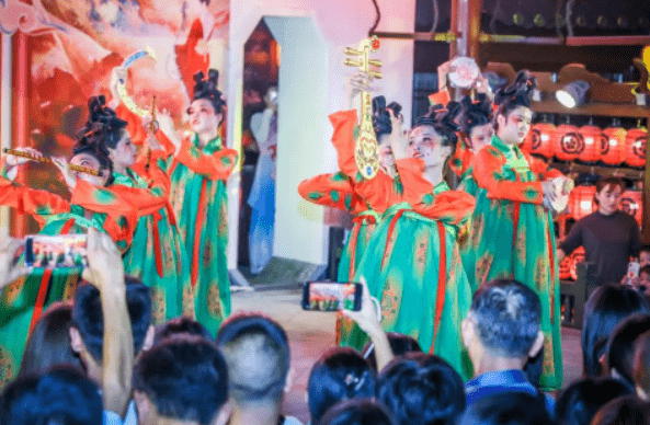 江苏盐城唐渎里集大唐风情、人文古韵以及娱乐美食为一体,以旅兴商的形式打造国内首个古韵盛唐与现代美食相融合的沉浸式体验街区。亭台楼榭、小桥流水,恍然间时空交错来到唐朝,精美的布景、悦耳的传唱、沉浸式唐风主题演艺活动一一上演。为了让唐渎里的场景“动”起来,景区中增加了众多的演绎表演。比如斗茶演艺、唐服饰演艺等等,丰富了唐渎里街区的功能性。