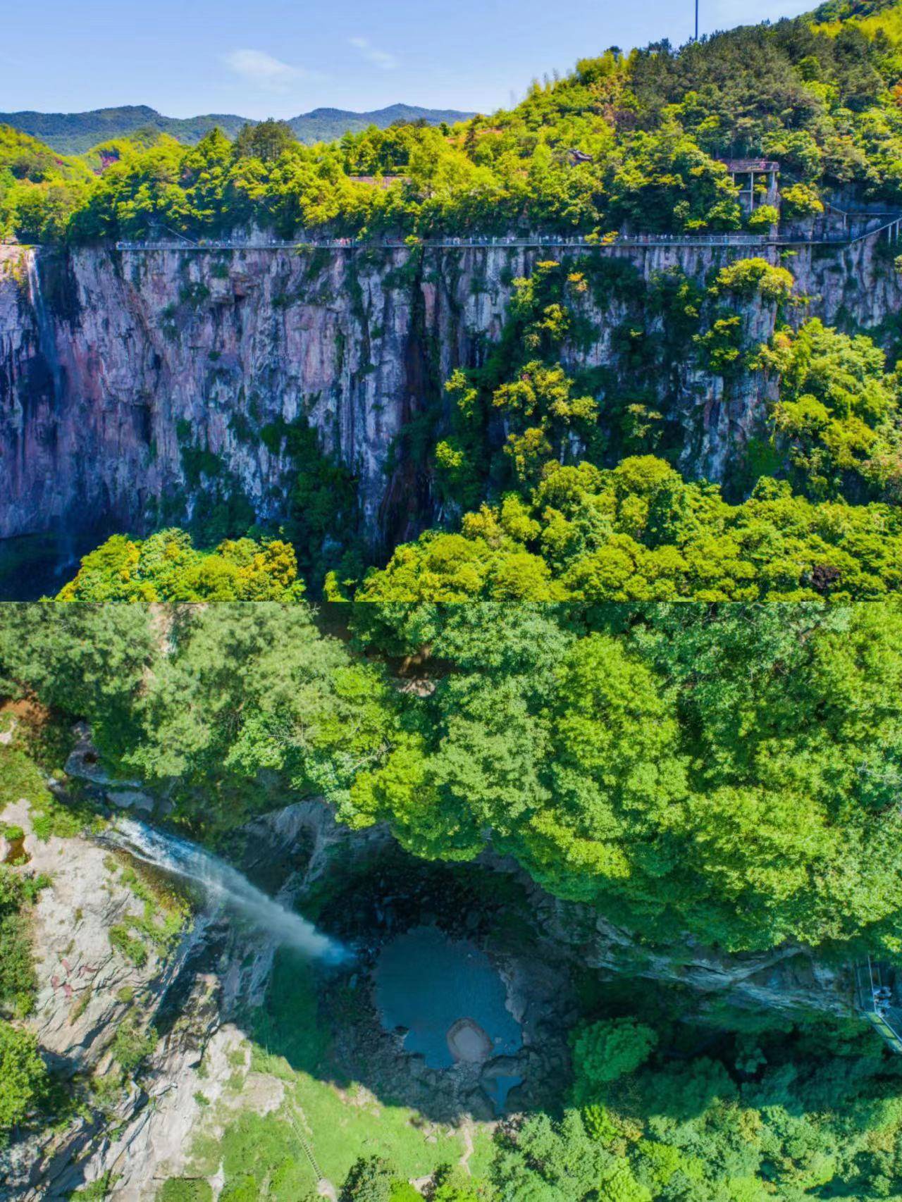 当你站在玻璃栈道的时候,从上帝的视角来看待峡谷夏日极致的茂盛,眼里是密林以及蓝天,在栈道的尽头是徐凫岩瀑布,再一次从高空悬空看瀑布依旧会被这个华东第一瀑给震撼到。