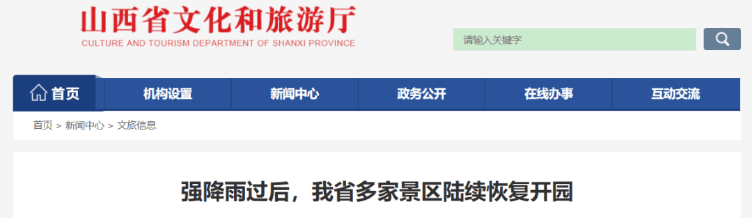 - 自7月31日至8月2日,大同恒山庙群区、悬空寺,阳泉藏山、大汖温泉,长治太行山大峡谷、黄崖洞文化旅游区,太原动物园、青龙古镇、晋阳湖公园、玉泉山,晋城湘峪古堡、大阳古镇以及忻州雁门关等景区已陆续恢复开放。