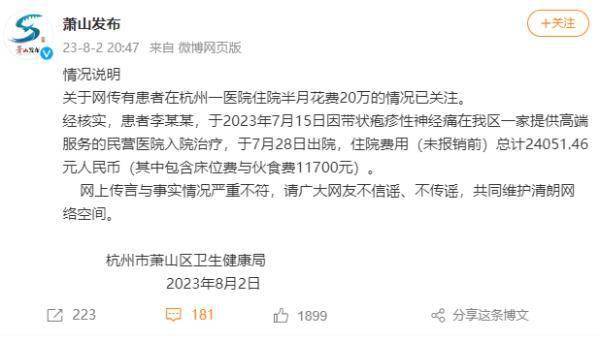 关于网传有患者在杭州一医院住院半月花费20万的情况已关注。