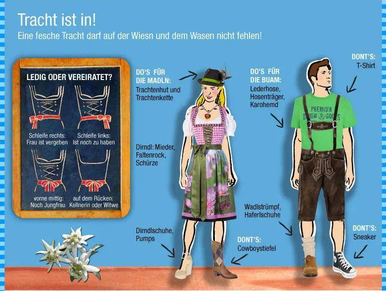 慕尼黑啤酒节当然上少不了巴伐利亚特色服饰!在这里,男女老少都会穿着传统服饰。男性服饰称为Lederhose(吊带皮裤),女性服饰为Dirndl(紧身连衣裙)。