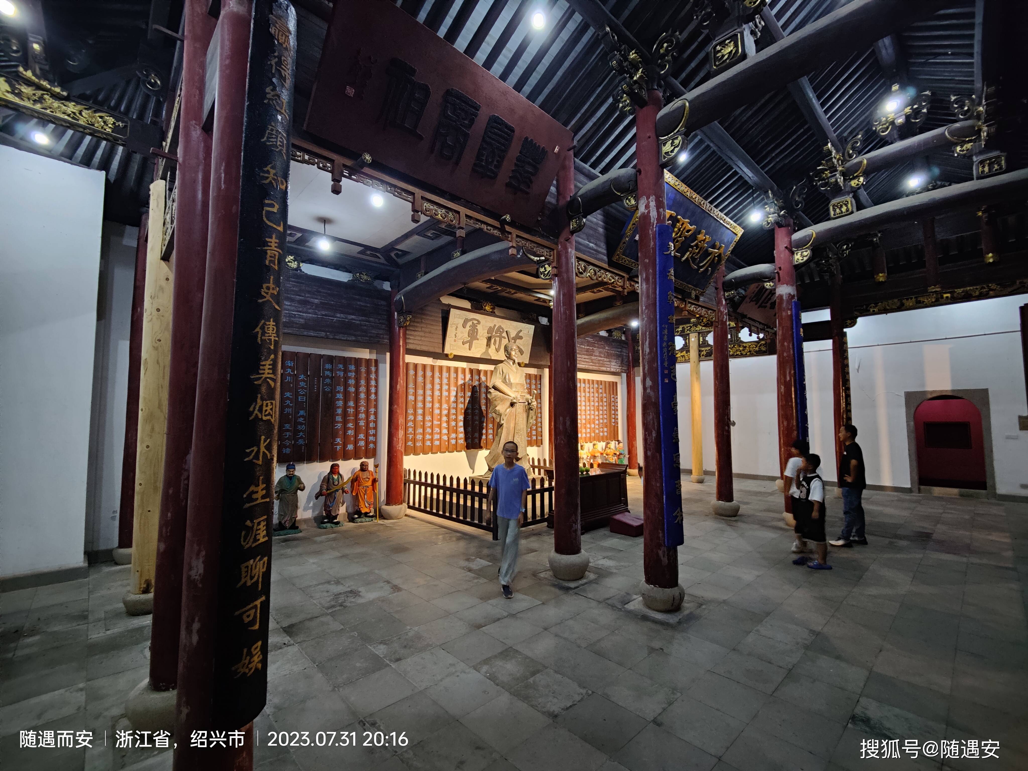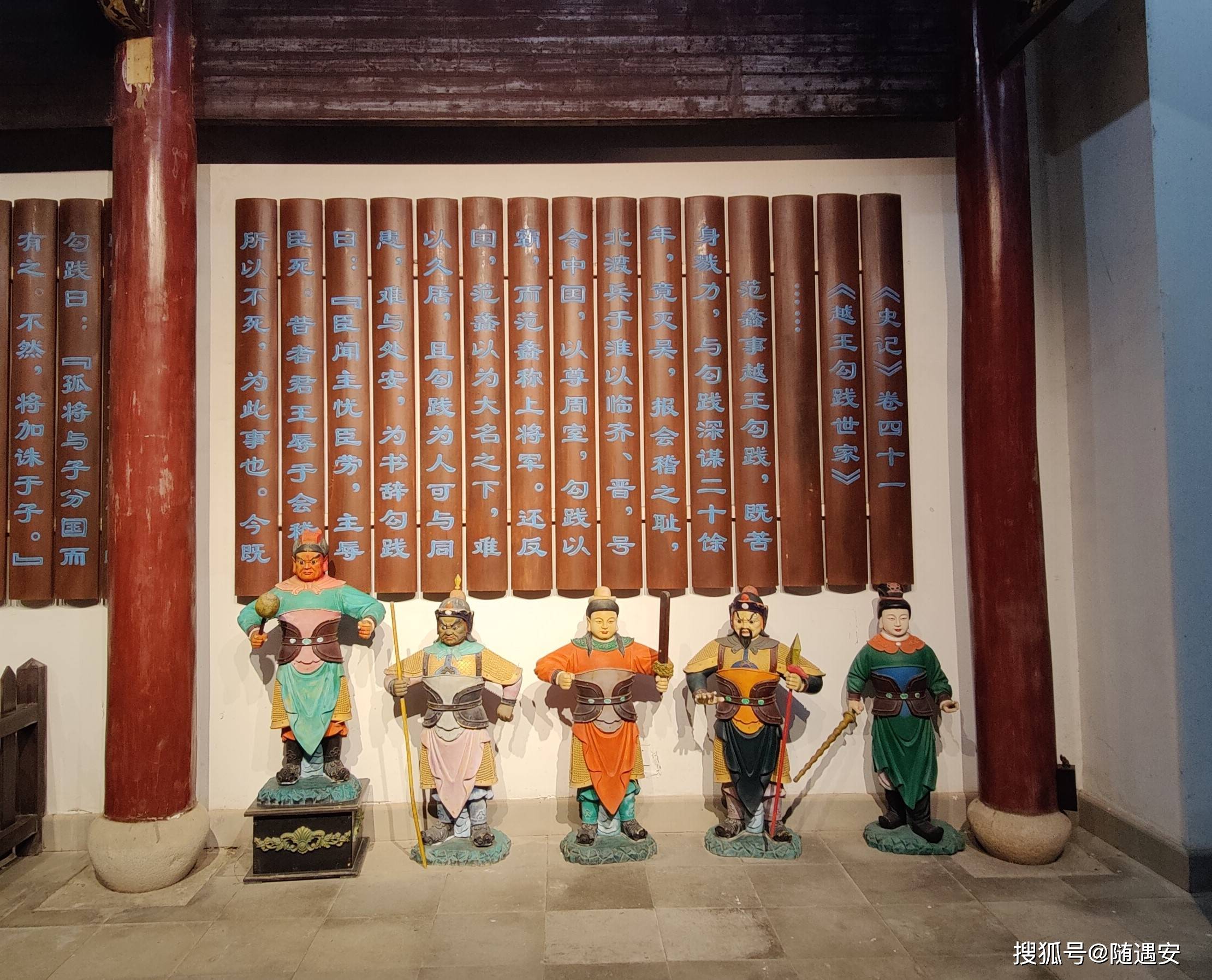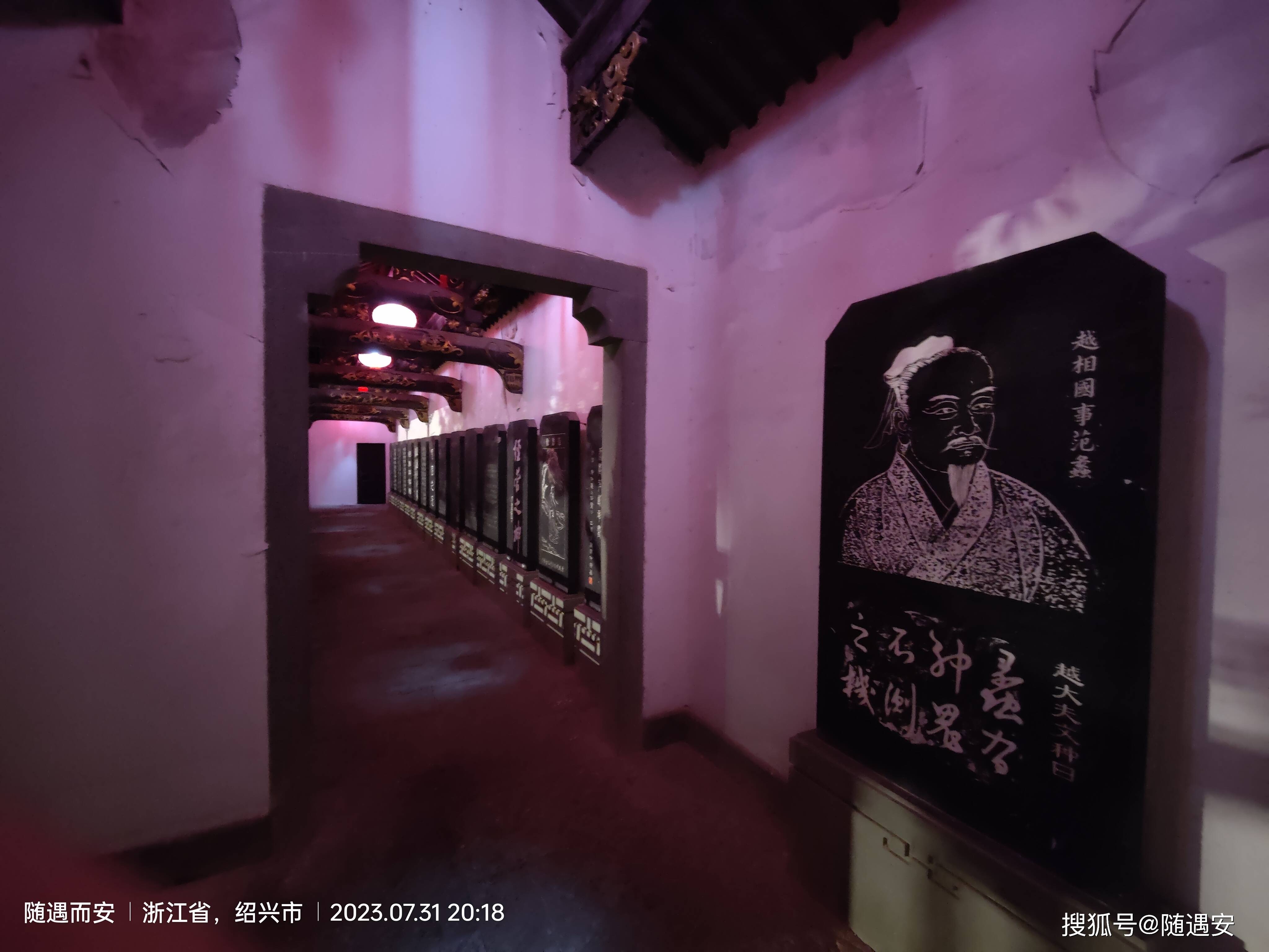 永寿寺的北边是范蠡祠。清晨尚未开门。幸好昨夜我已经捷足先登,入内看了夜景。夜里,灯光辅射下的范蠡祠,别有一番风味。正殿内站立范蠡全身铜像高3.5米,上有匾额“于越圣臣”。铜像背后墙面用木条仿竹简形式,再现《史记》中记载范蠡故事的精彩篇章,所有立柱均镶嵌楹联。