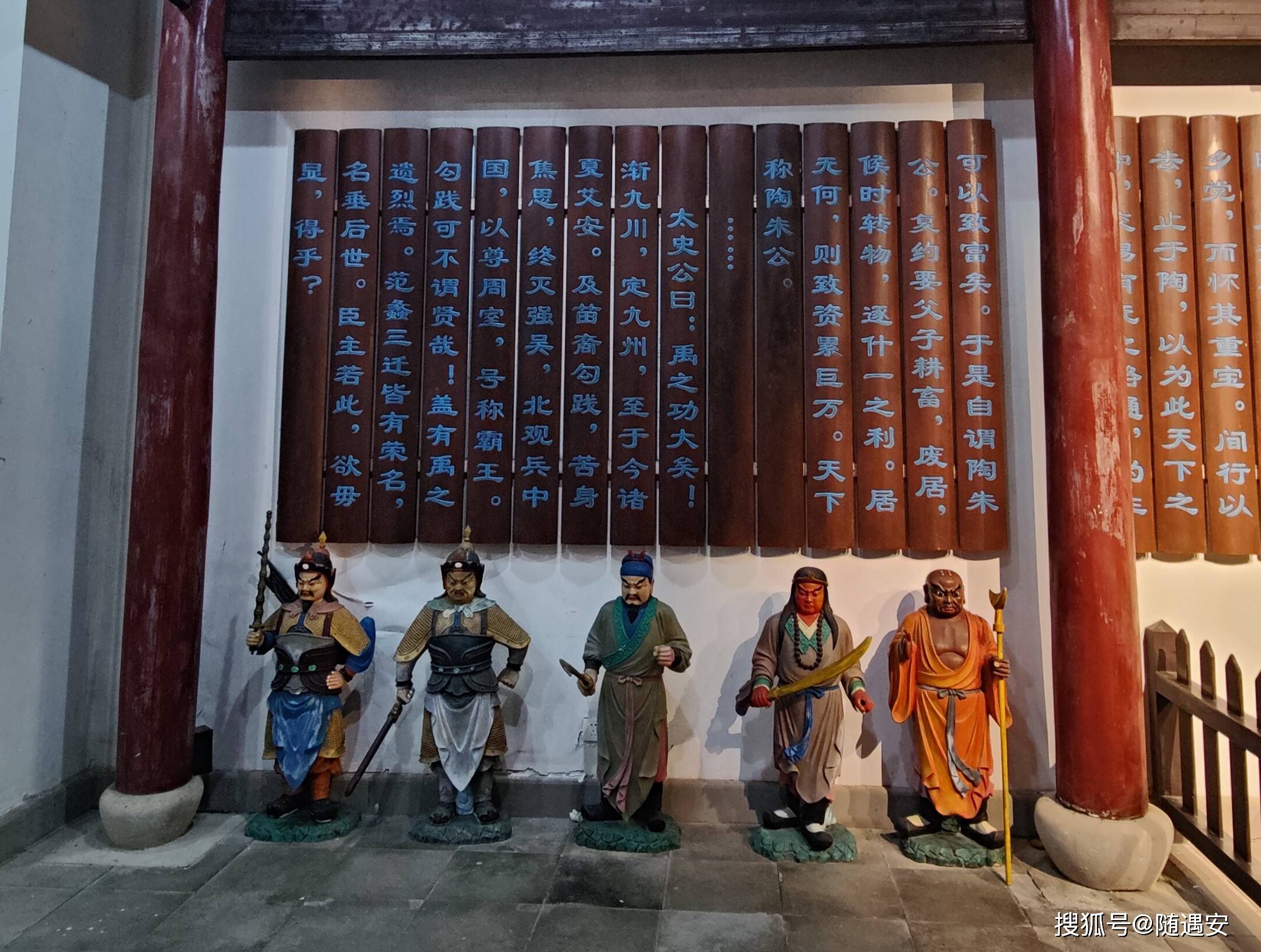 范蠡铜像两侧,立有10尊采取民间传统贴金彩绘相结合的形式的塑像神态各异,活灵活现。