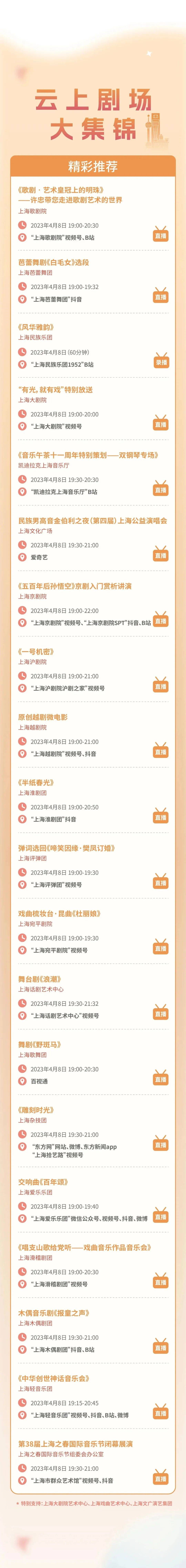 携手上海大剧院艺术中心、上海戏曲艺术中心、上海文广演艺(集团)有限公司的线上演艺资源,并优选各区特色文旅活动,开展云上大联播,打开随时随地的美育方式。