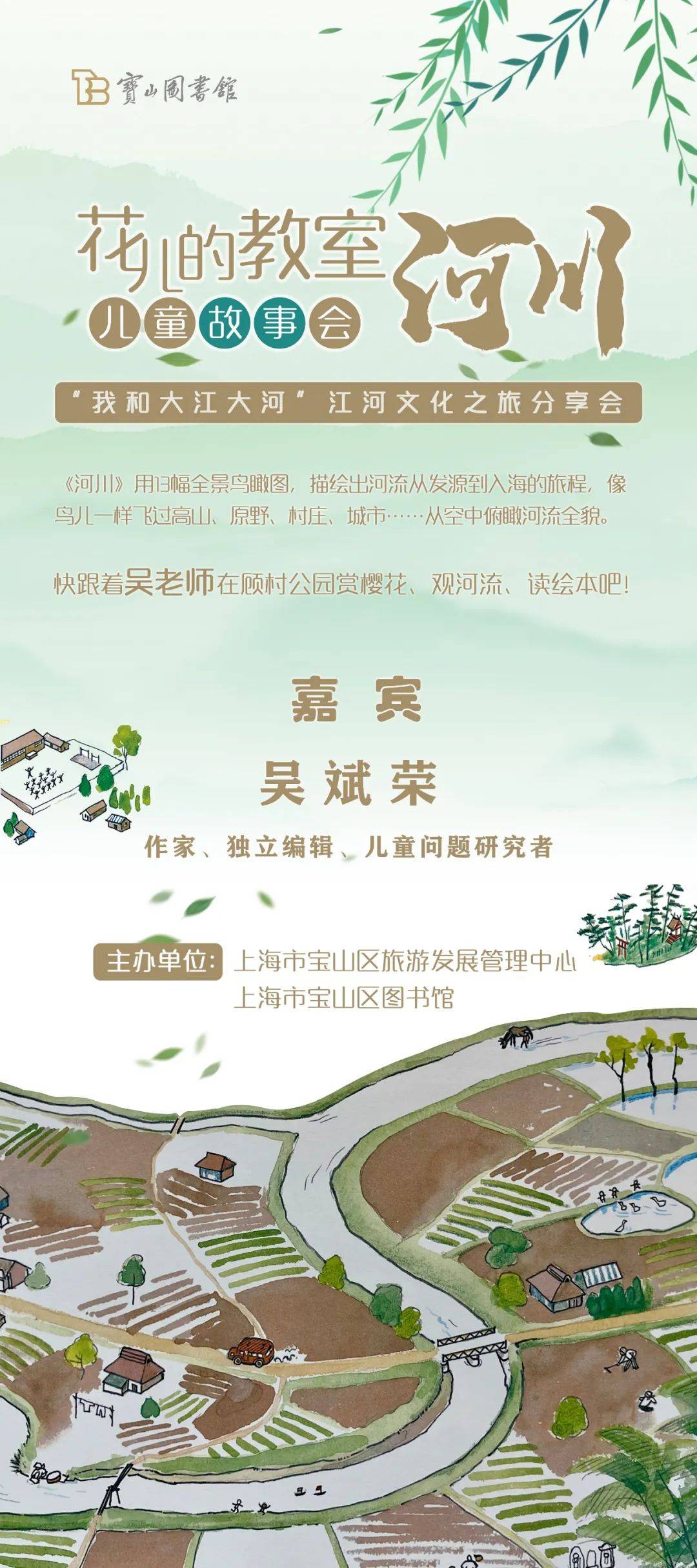 为首届长江河流生态文化节预热,旅游中心与区图书馆合作推出江河文化之旅分享会。特别邀请宝山区作家协会副主席吴斌荣老师分享绘本《河川》,带领亲子家庭开启一场奇妙的纸上旅行。