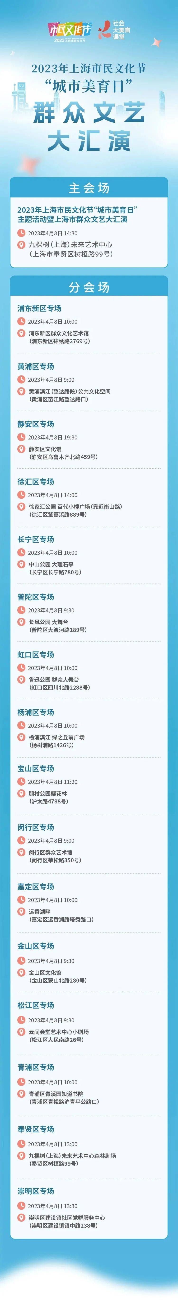 以九棵树(未来)艺术中心为主会场,全市十六个区为分会场,全面开启“城市美育日”主题活动,举办1+16的群众文艺大汇演,展示上海市民文化节十年办节成果。