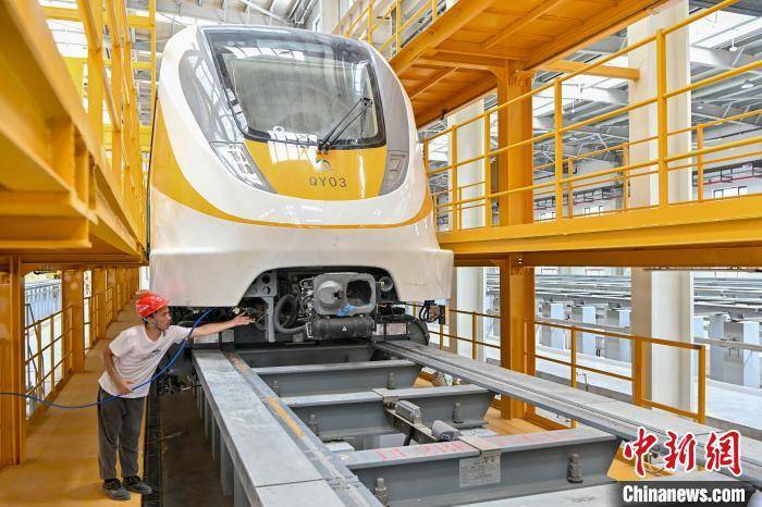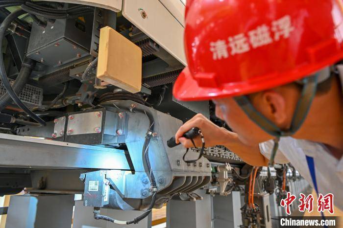 工作人员检查磁浮列车的悬浮传感器。 陈骥旻 摄