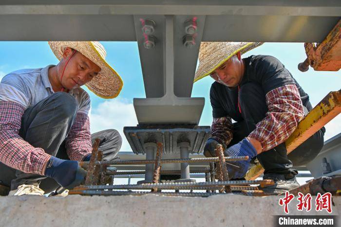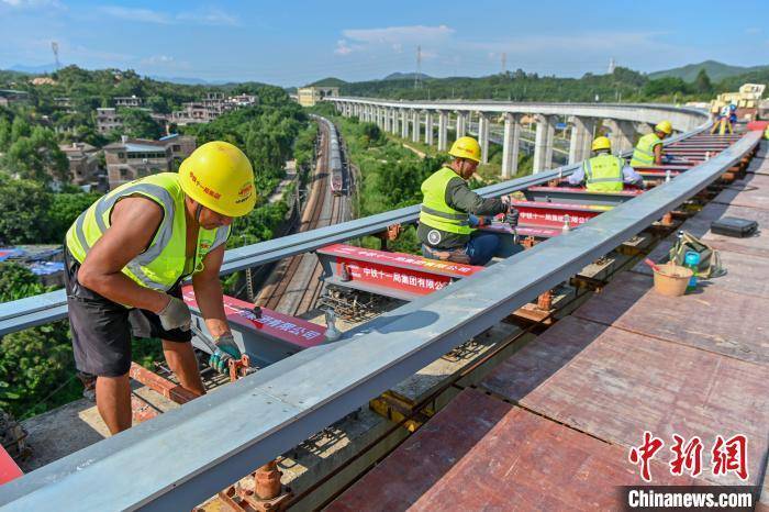 工作人员安装磁浮列车轨道。陈骥旻 摄