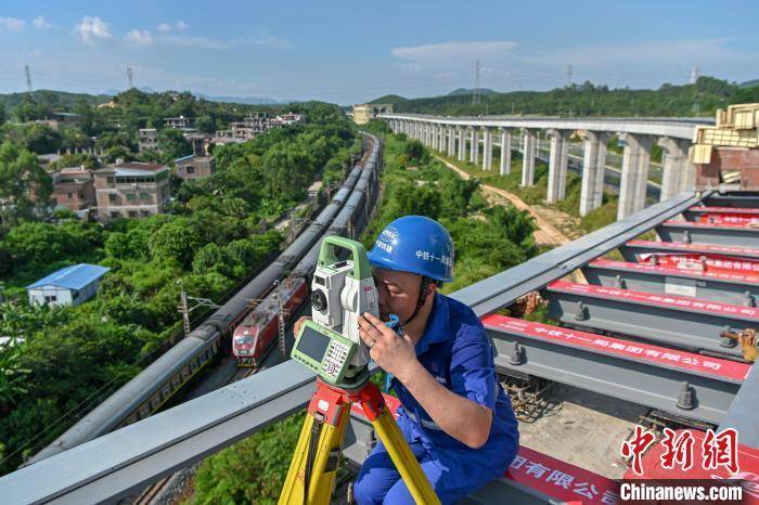 测量员进行磁浮列车轨道精调。 陈骥旻 摄