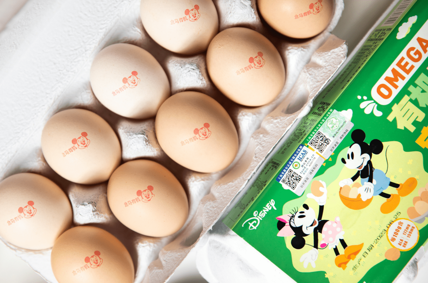 另外,盒马与迪斯尼中国合作的有机OMEGA-3富硒宝宝蛋,充分将盒马的供应链优势与IP创意内容进行了结合。这些外壳上印着米奇头像的宝宝蛋,诞生于盒马在安徽池州的有机鸡蛋盒马村。
