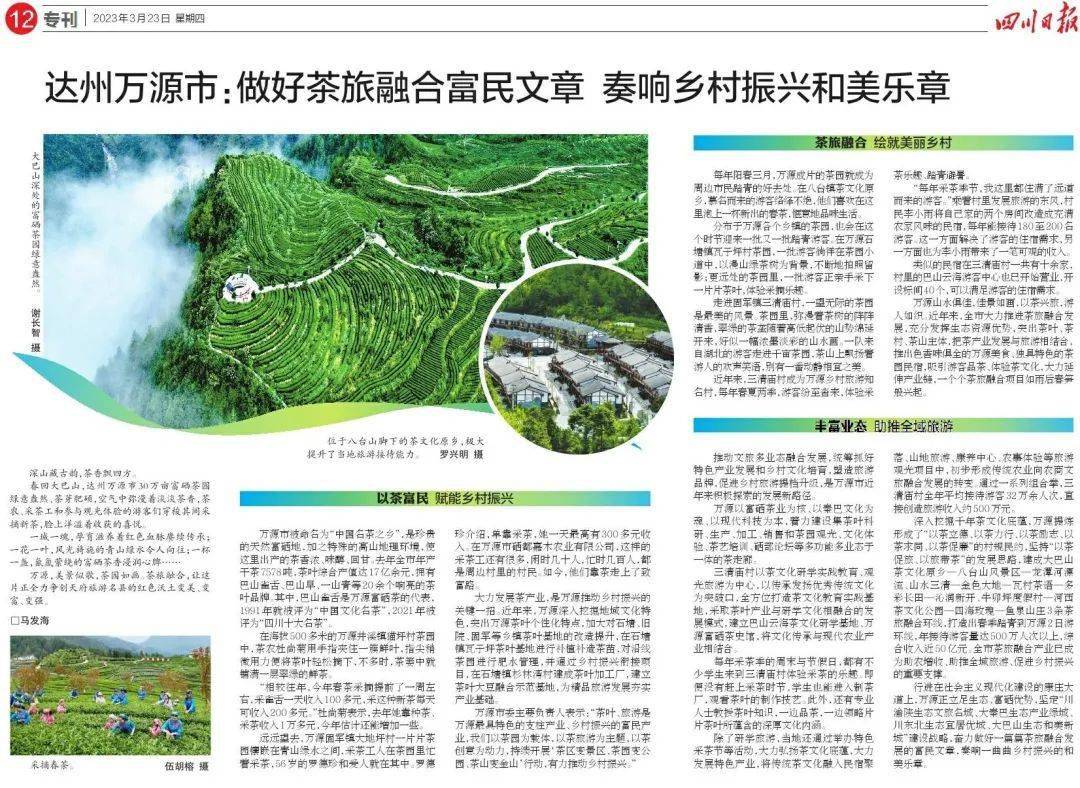 万源市委主要负责人表示:“茶叶、旅游是万源最具特色的支柱产业、乡村振兴的富民产业,我们以茶园为载体,以茶旅游为主题,以茶创意为动力,持续开展‘茶区变景区、茶园变公园、茶山变金山’行动,有力推动乡村振兴。”