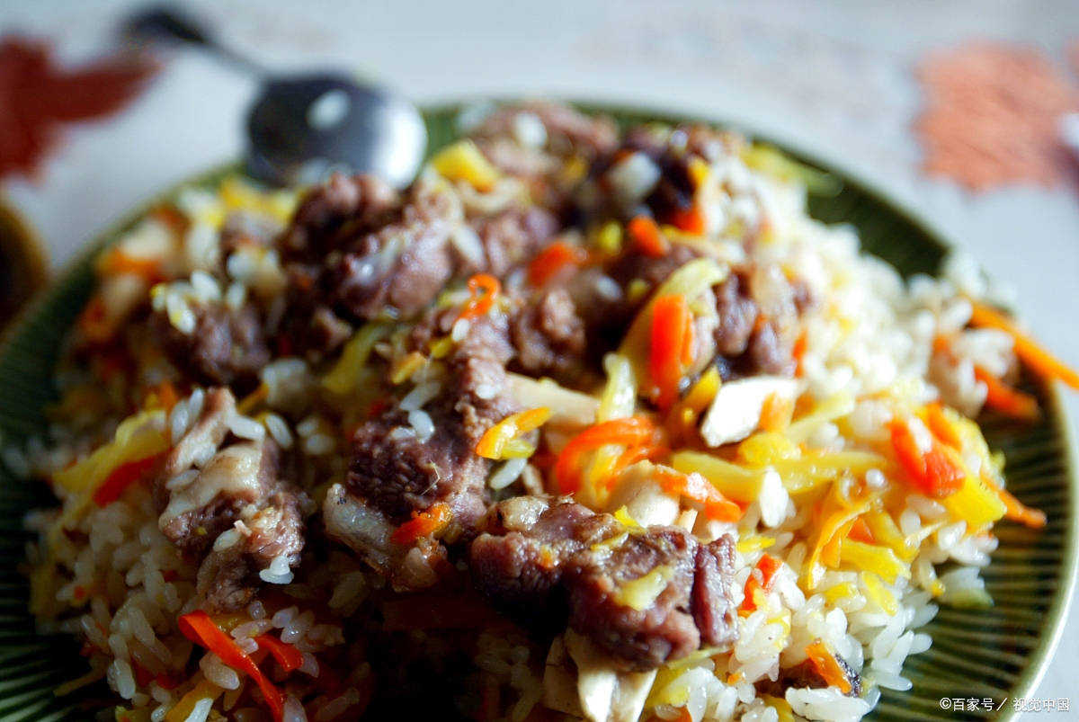 1. 羊肉抓饭:这是新疆最有名的美食之一,由米饭、羊肉丁、胡萝卜丁、葡萄干等组成,用手抓着吃。美食香气四溢,口感丰富,辛香中带有一丝甜味,营养丰富。