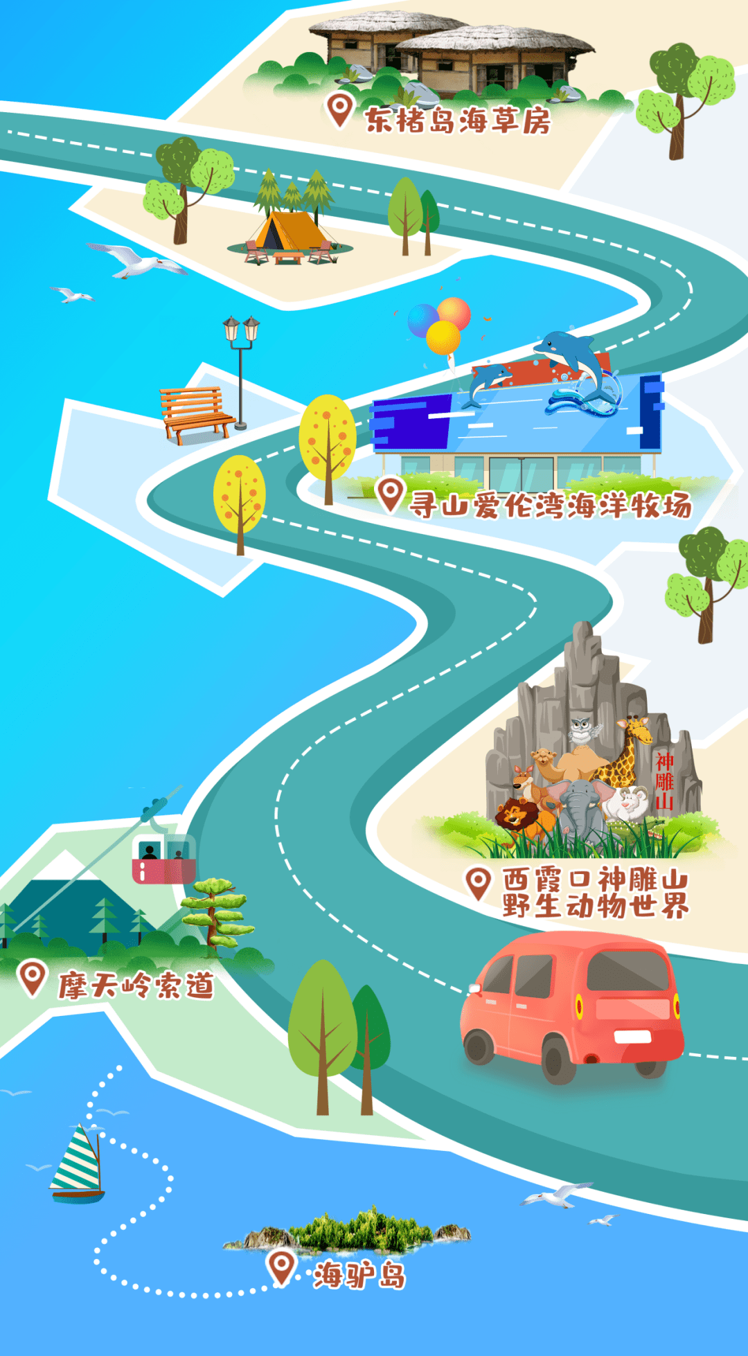 导航搜索:香海豪生度假酒店/威海东浦湾房车营地,沿路可欣赏威海千里山海自驾旅游公路的美景。