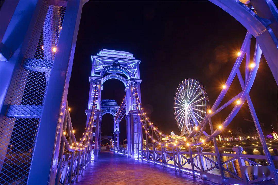 如水的月色晕染着墨蓝的天空,多彩的霓虹点亮那香海的夜晚,蓝桥的灯光莹莹闪烁,整个桥体呈现出梦幻般的蓝色,身后还有多彩的摩天轮和旋转木马,为你点亮一个英伦风的童话。