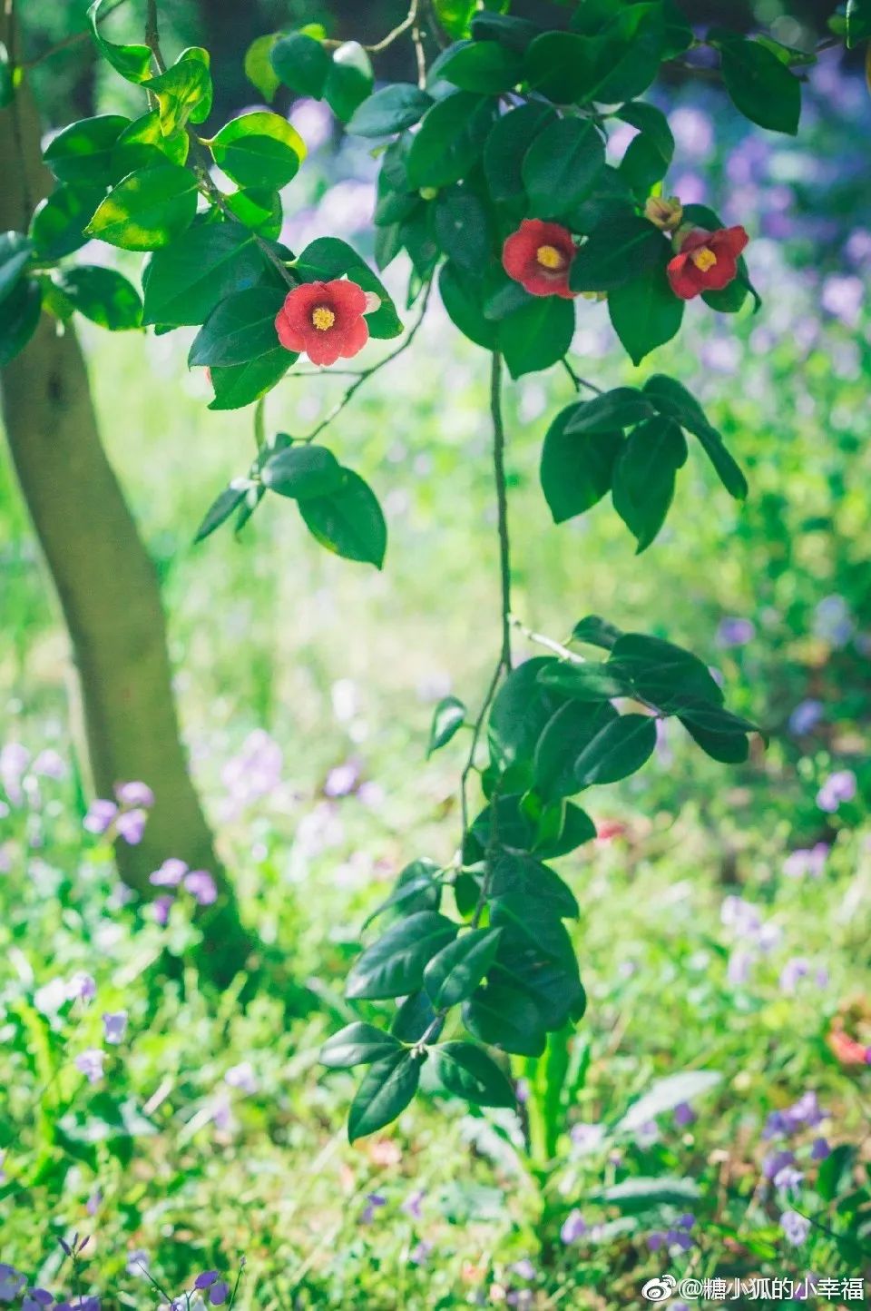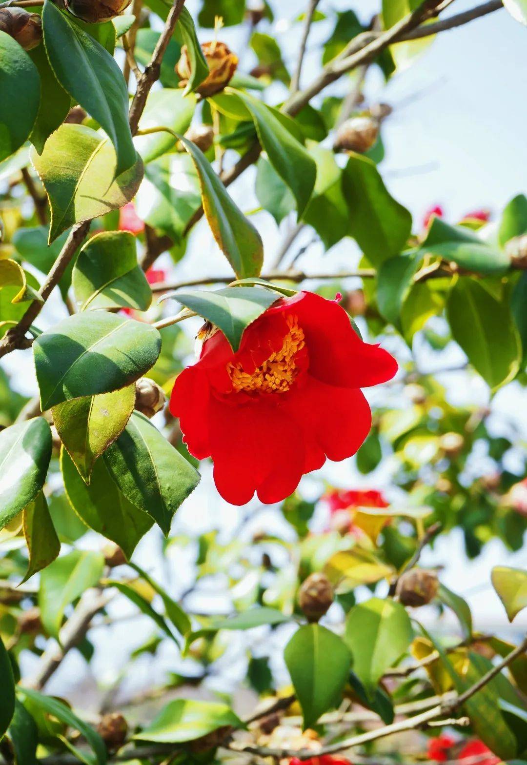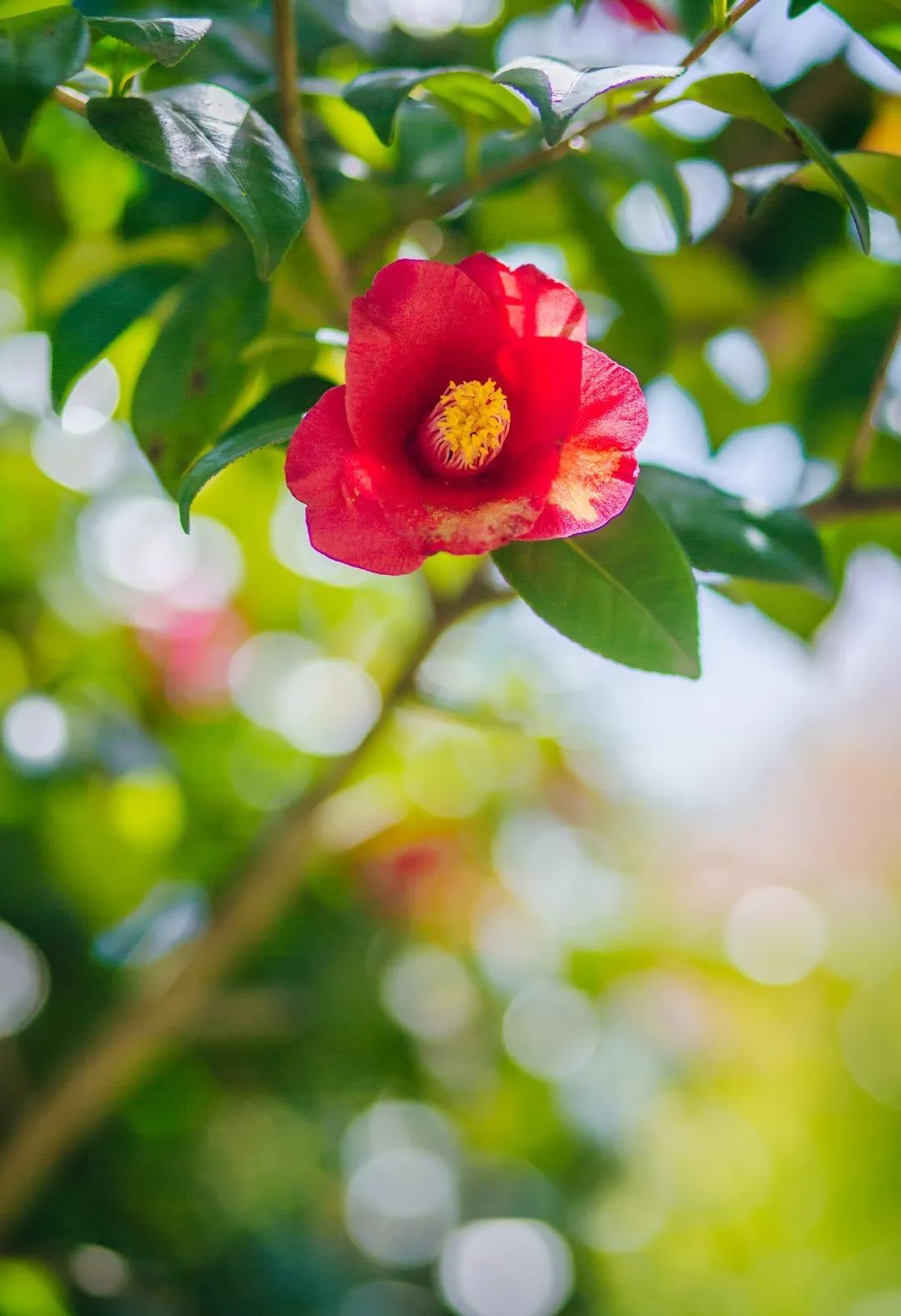 春天的百花苑里,各种花卉次第开放,红艳的耐冬花也纷纷从绿叶中探出头,花姿丰盈,端庄高雅,安静却也耀眼。