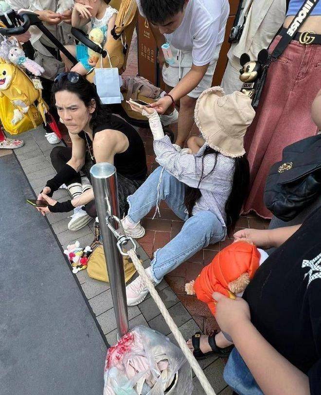 或许是为了迎合女儿的喜好,向佐郭碧婷径直去到了花车项目的排队入口,但由于时间过早,只能在路边静静等待。由于上海当天的气温较高,加上两人已经兜兜转转了许久,体力消耗极大,无奈之下,索性直接盘腿坐在了地下。