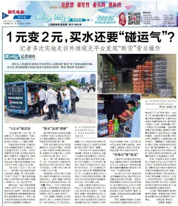 “8月1日您反映的外滩观光平台饮用水‘断货’等问题,我办高度重视,立即对此情况进行了调查核实,经查,由上海百事可乐有限公司经营的饮用水确实存在‘断货’现象。”