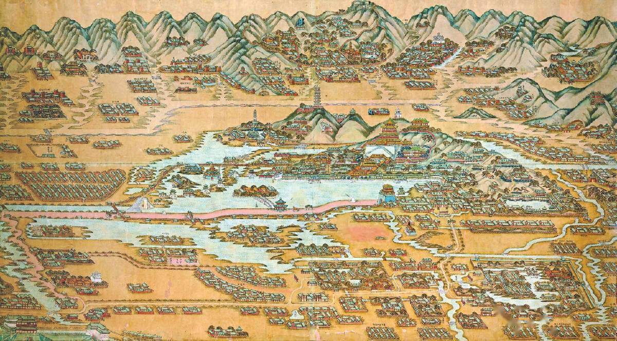 明代,随着永乐皇帝迁都北京,大批江南文人、官宦来到北京,进一步推动了北京西郊的人文开发。瓮山泊水位此前已经得到控制,因此,环湖一带寺庙、园林建置渐多。湖中遍植荷花,周围水田遍插稻谷,湖旁又有寺院、亭台之胜,可谓山水俱佳、风景优美。也是在这一时期,瓮山泊改称为“西湖”。“西湖十寺”“西湖十景”“宛如江南风景”“环湖十里,一郡之盛观”等,都是时人对西湖周边自然风光的赞誉。每年桃红柳绿之时,京城百姓扶老携幼,争往西湖踏青赏春,称作“耍西湖景”。据说正德皇帝、万历皇帝都曾在此泛舟、钓鱼。京西一带成为达官贵人集中建造私家园林的区域。在这里,皇家行宫、私家园林和名门古刹汇集,“京西小江南”初具规模。