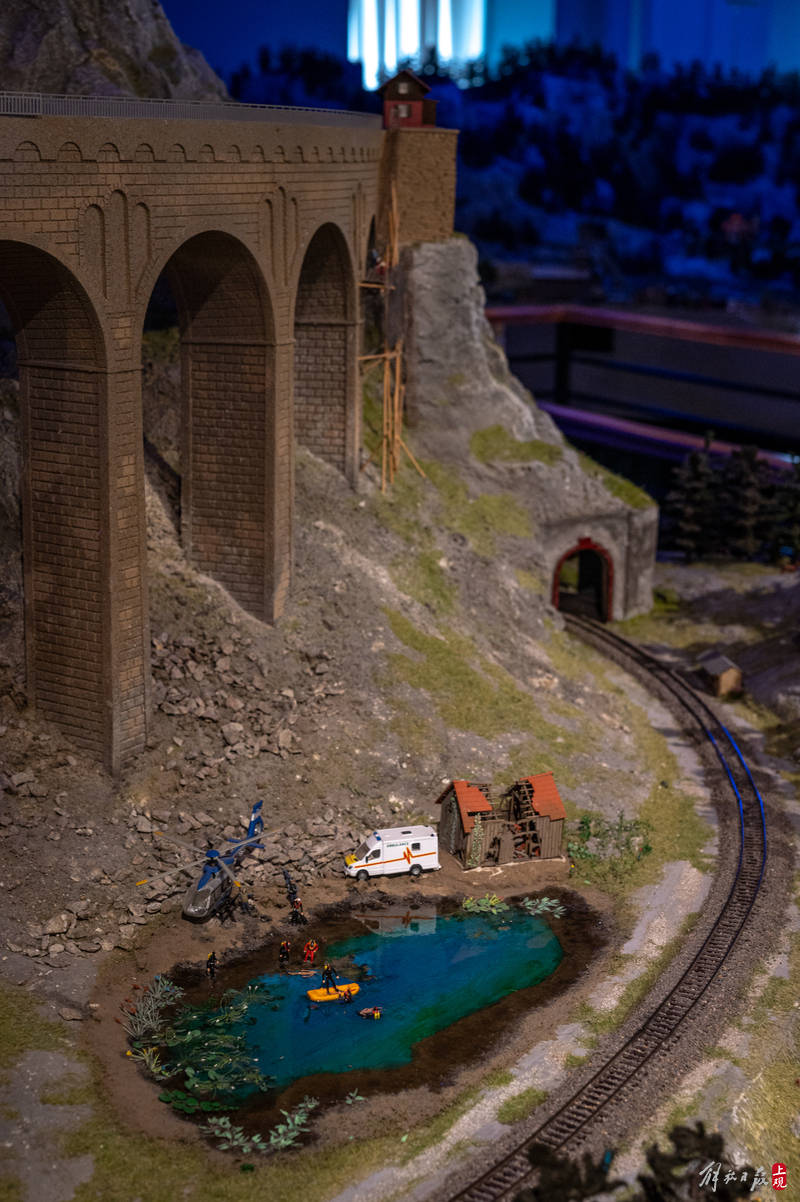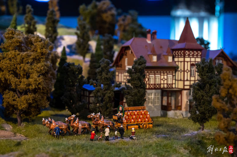 “大梦微城”展不免费,乍一看不算便宜,不过这个地方有没有看头,可以先用一组数据说话:这个以德国城市、奥地利山村,瑞士小镇为主要视觉元素的沙盘占地超过300平方米,以1:87的比例,精准还原30多辆不同国别、造型列车的同时,还打造出各种带有剧情设计、自然景观、工业生产、文化生活、突发事件的场景,使用到的造型各异的小人超过5万个。