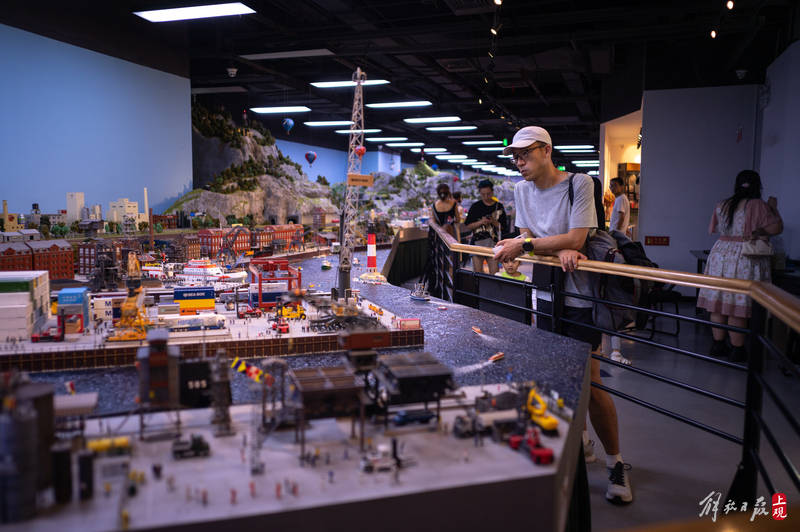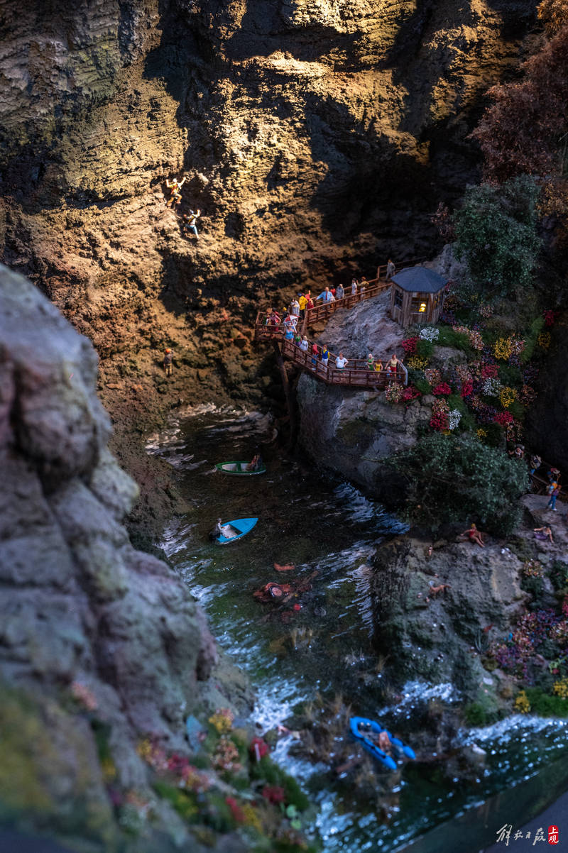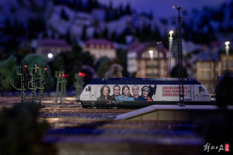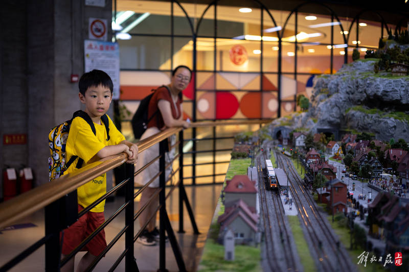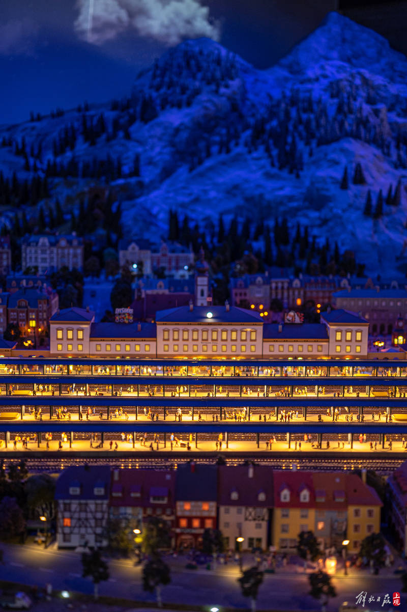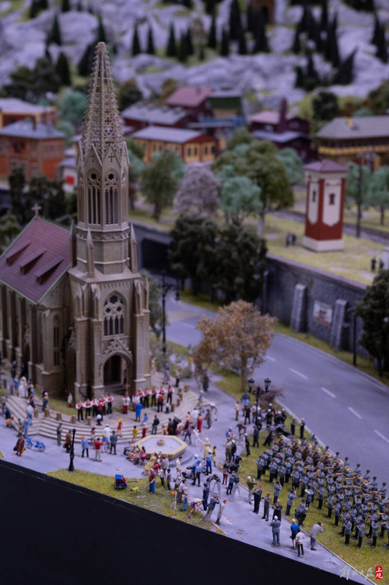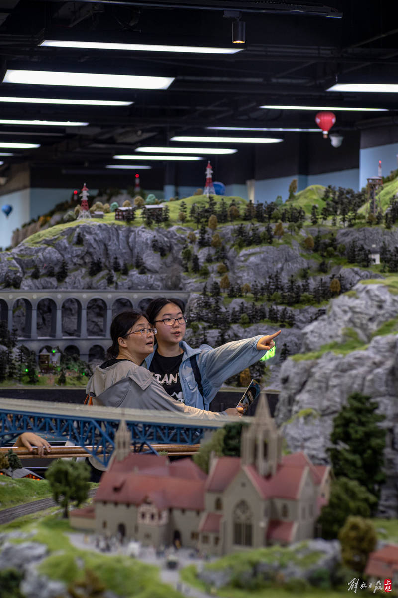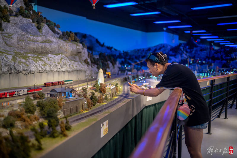 一艘产自奥地利的豪华列车缓缓前行,穿越阿尔卑斯山脉隧道,迎面而来的是绵羊与木屋田园牧歌的图景。再往前经过钢结构大桥,桥下河水潺潺,一群游客在悬崖边架设的栈道上,欣赏着巨大落差带来的壮丽景观……这不是欧洲列车风光片里的场景,而是上海一座火车主题沙盘的小小一隅。