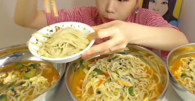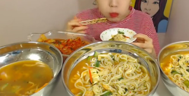 不得不说这韩国的拉面还是历史悠久的,承继了韩国特色,汤底都会有些辛辣口感,蔬菜和面条份量相当,三大盆看起来也是非常惊人,看着你完全不会料想得到小姐姐能吃完这些的,因为实在太多,可能正常得是八九个人的份量还差不多。但是小姐姐是真的能吃还是超级能吃的那种,一口一口拉面咽下去毫无感觉那般。虽然有搭配到一些泡菜可能会觉得爽口一些不会太腻,但是这吃法还是很吓人的。