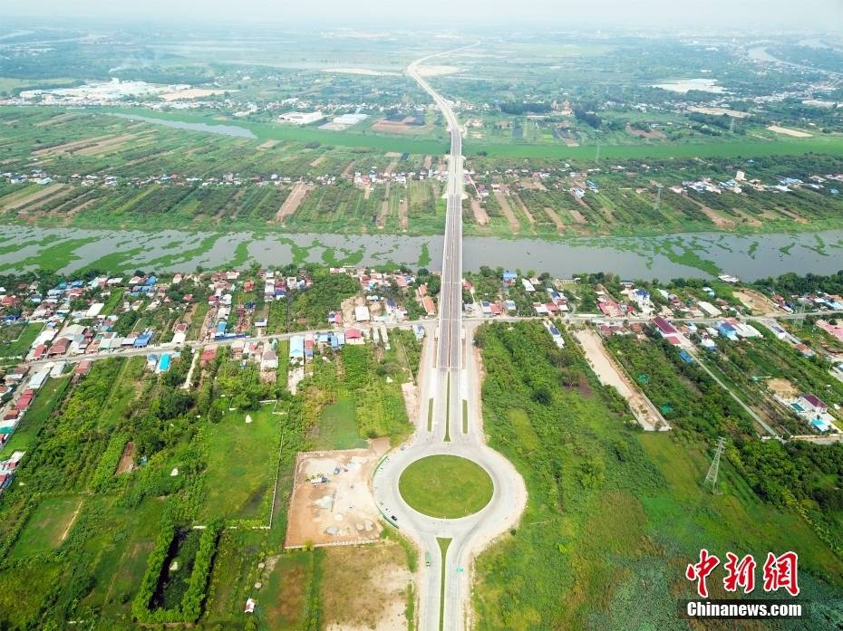 6月7日航拍的金边第三环线公路巴萨河大桥。(无人机照片)中新社发 朱子杰 摄