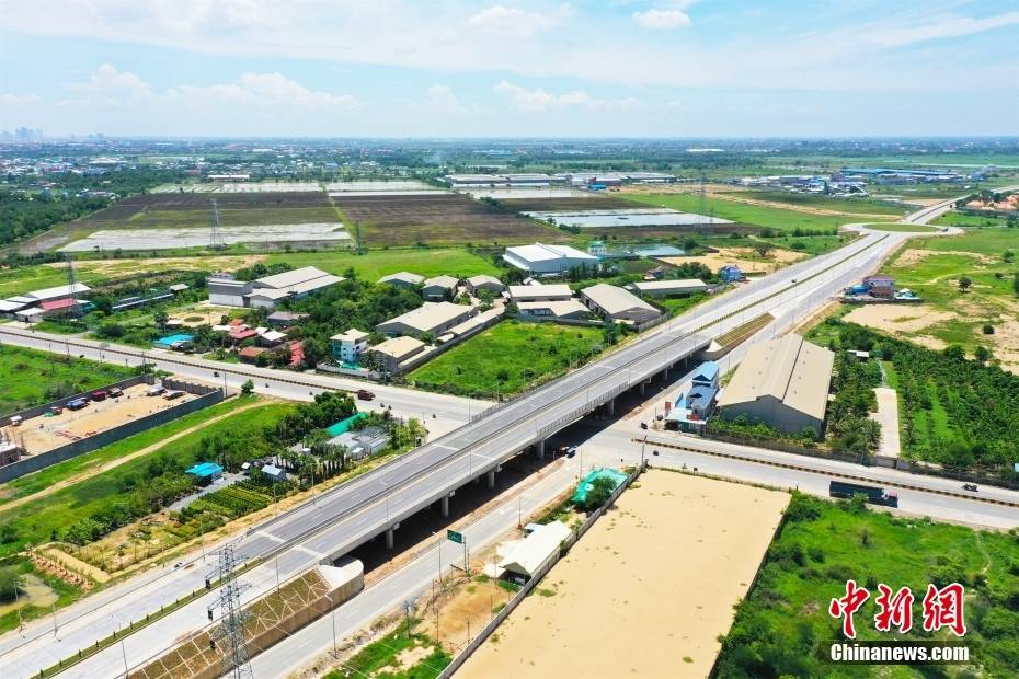 6月14日航拍的金边三环路与3号公路互通立交。(无人机照片)中新社发 朱子杰 摄
