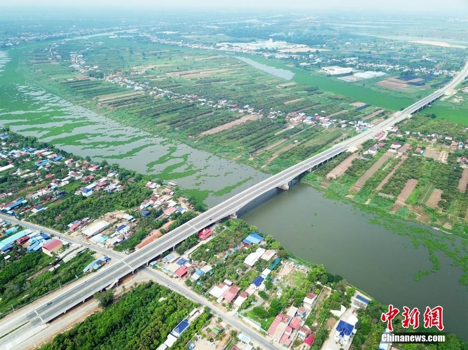 6月7日航拍的金边第三环线公路巴萨河大桥(中柬友谊大桥)。(无人机照片)中新社发 朱子杰 摄