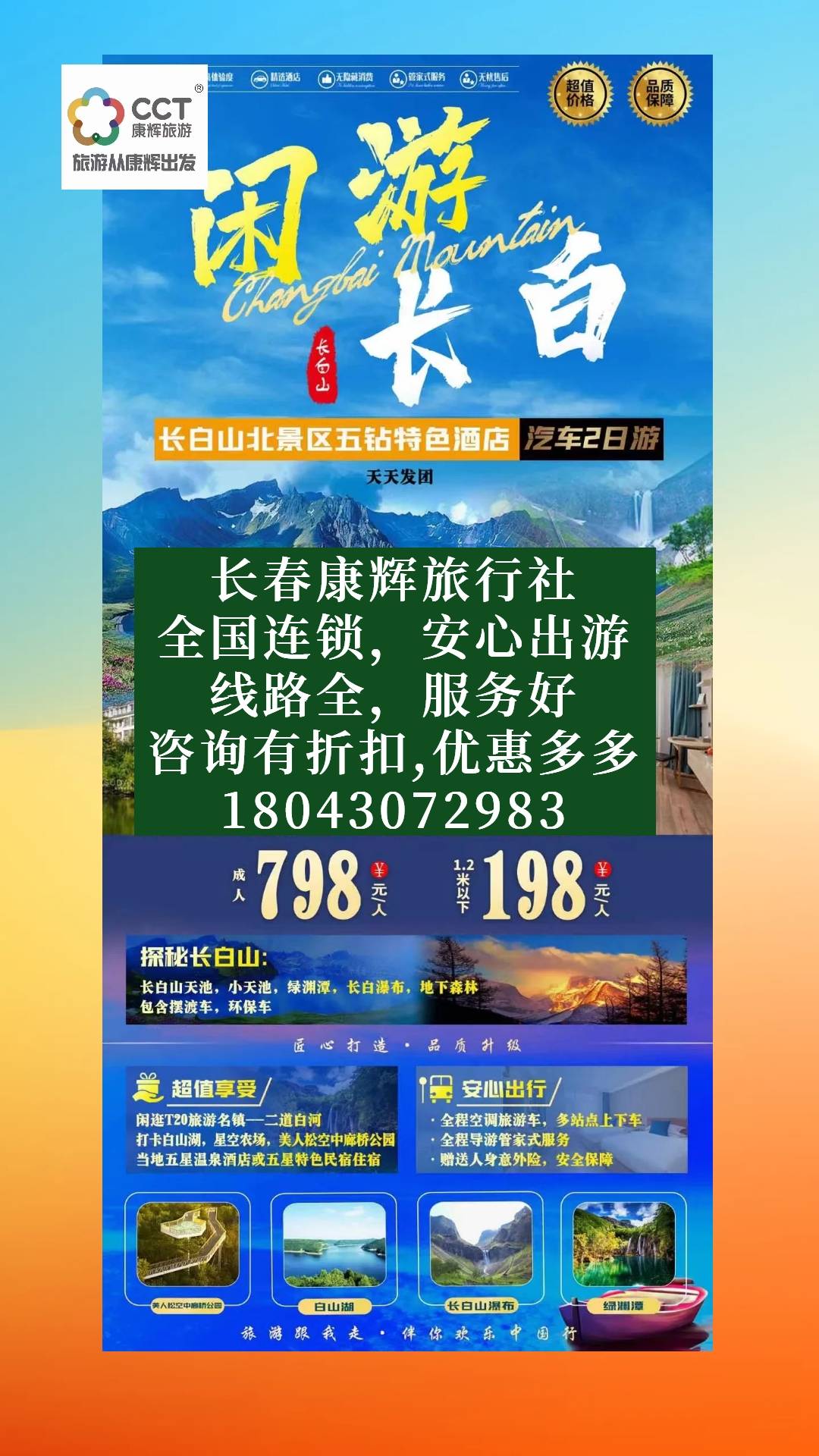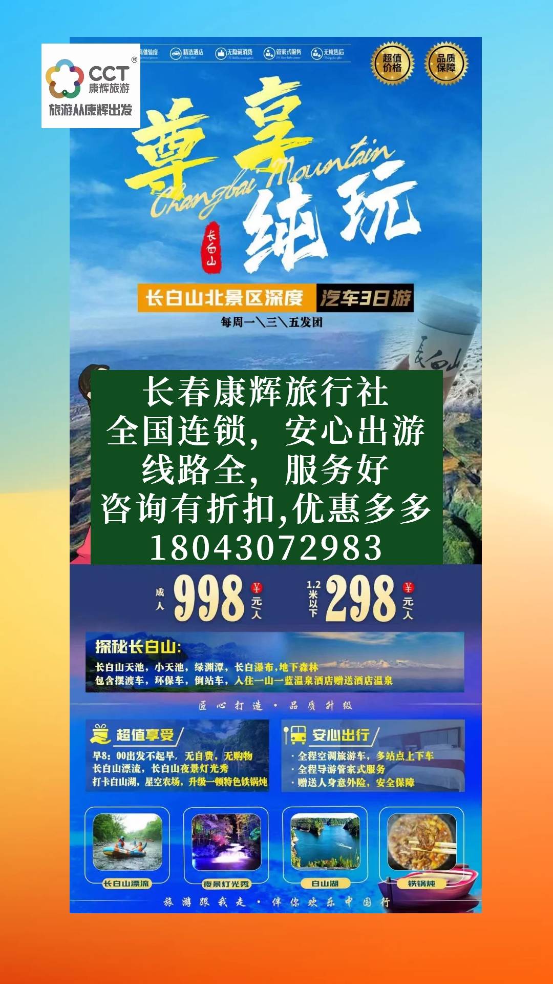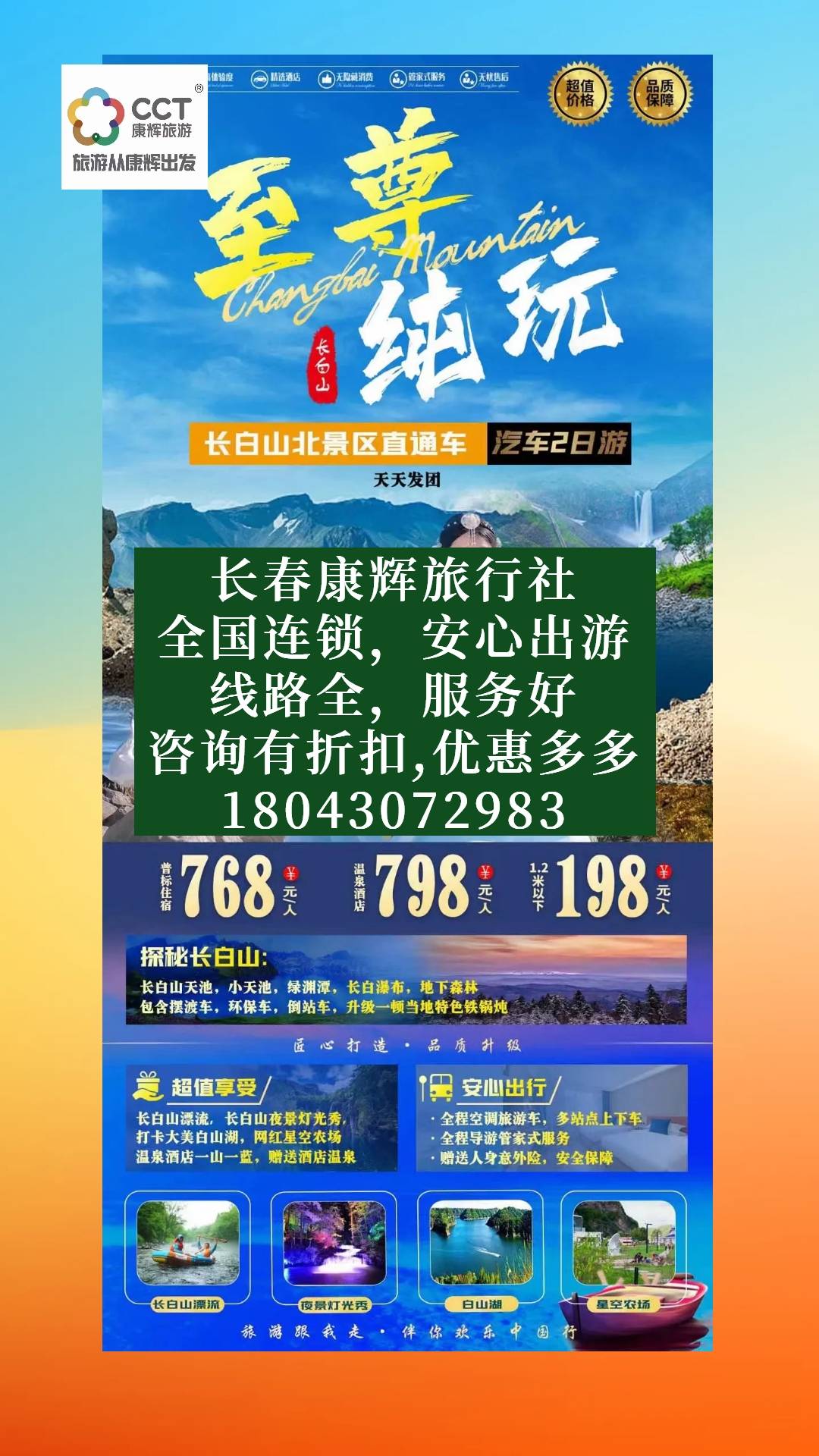 我们将从长春出发,舒适的旅游大巴将带您穿越郁郁葱葱的森林和蜿蜒的山路,途中您将享受到美丽的自然风光。到达长白山脚下后,我们将搭乘缆车,直达海拔约1800米的天池。在清澈见底的湖水中倒影下,您可以尽情欣赏到令人窒息的美景。无论是蓝天白云的日子还是云雾弥漫的雾天,天池都散发着令人陶醉的神秘气息,让您仿佛置身于仙境一般。