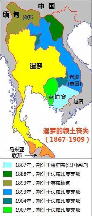 到了19世纪末,泰国的东南西北四邻已经皆被英国和法国控制,自己则成为整个东南亚地区唯一的“独立国家”。1896年时,英法两国为了避免直接冲突,只好将其规定为英属缅甸和法属印度支那之间的缓冲国,谁也不去直接染指。