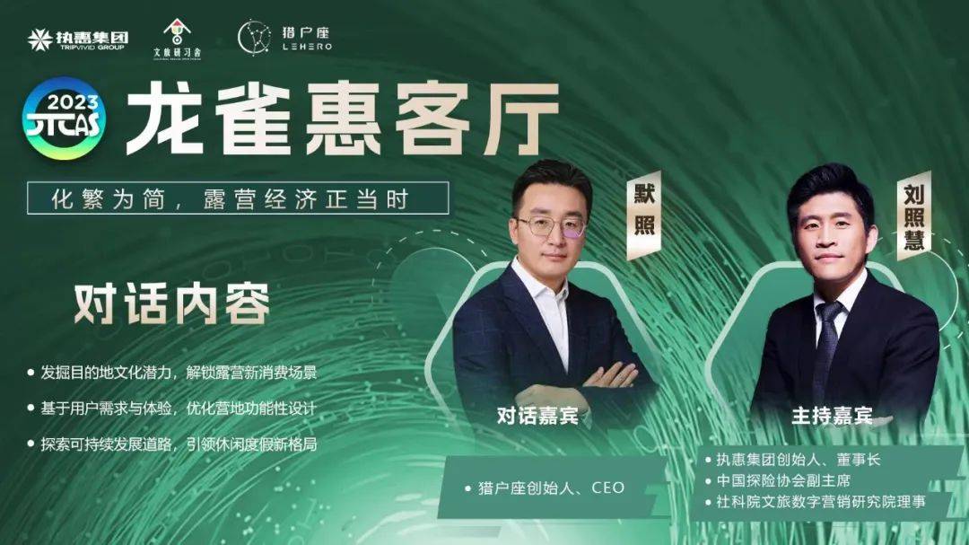 刘照慧:各位文旅同仁,大家上午好。欢迎来到龙雀惠客厅。今天的议题是"化繁为简,露营经济正当时"。非常荣幸邀请到猎户座创始人暨CEO默照与我们共同探讨,请默照总跟大家打个招呼。