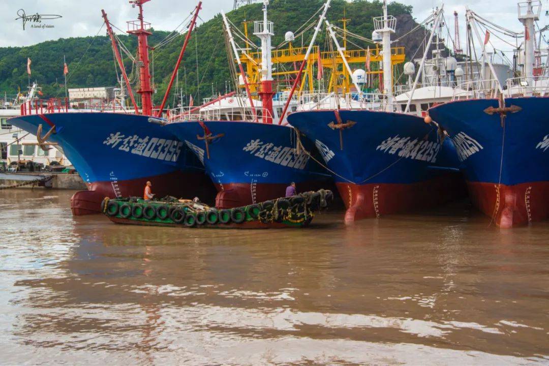 或许是受天气影响,整个沈家门渔港始终向我展示出一幅幅“懒洋洋”的画面,就算有船只在来回穿梭,数量也是少得可怜。偶尔有一两条全身挂满轮胎的小船围着大船们来来回回打转,看船上那几位略显忙碌的身影,可能是在清理或者保养。