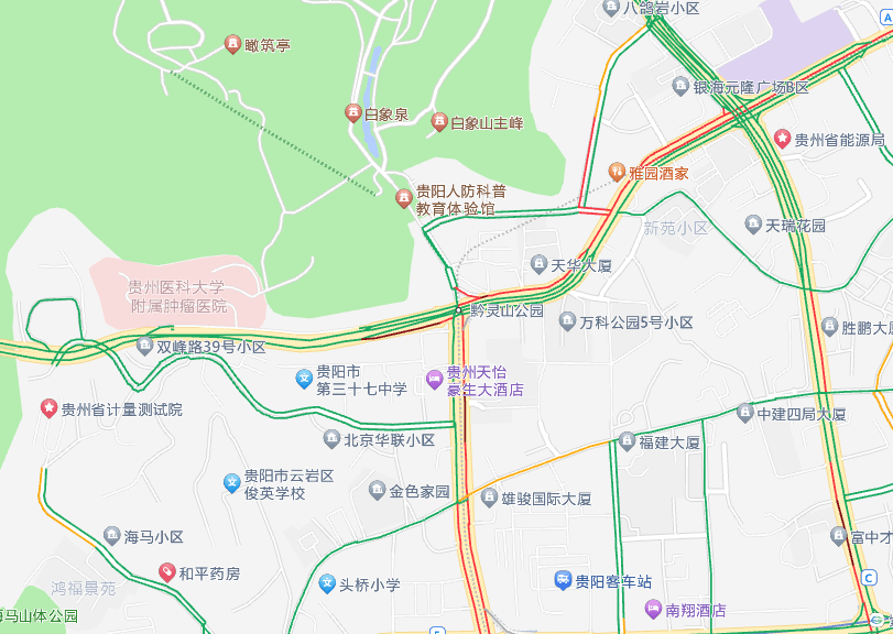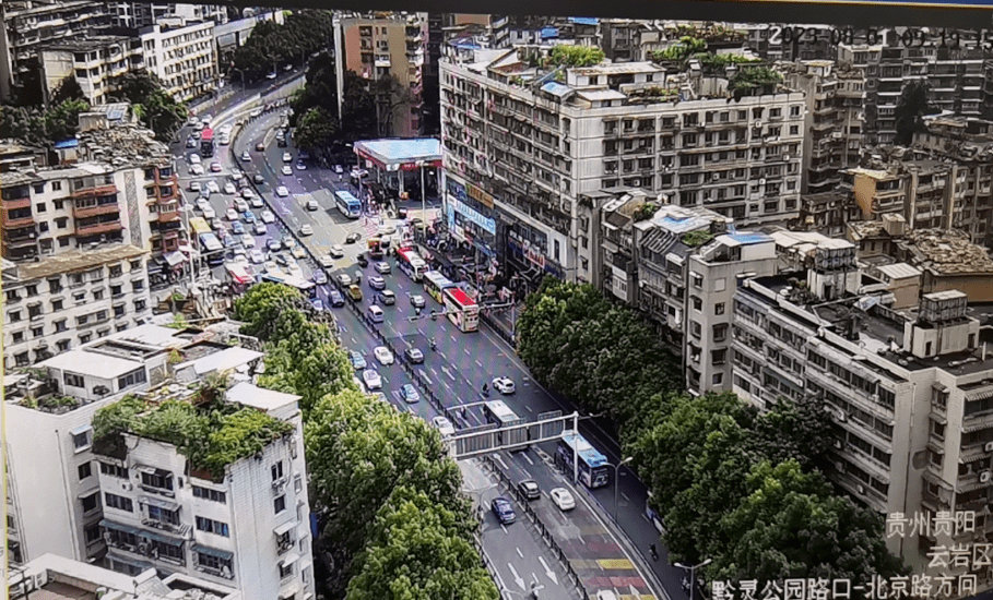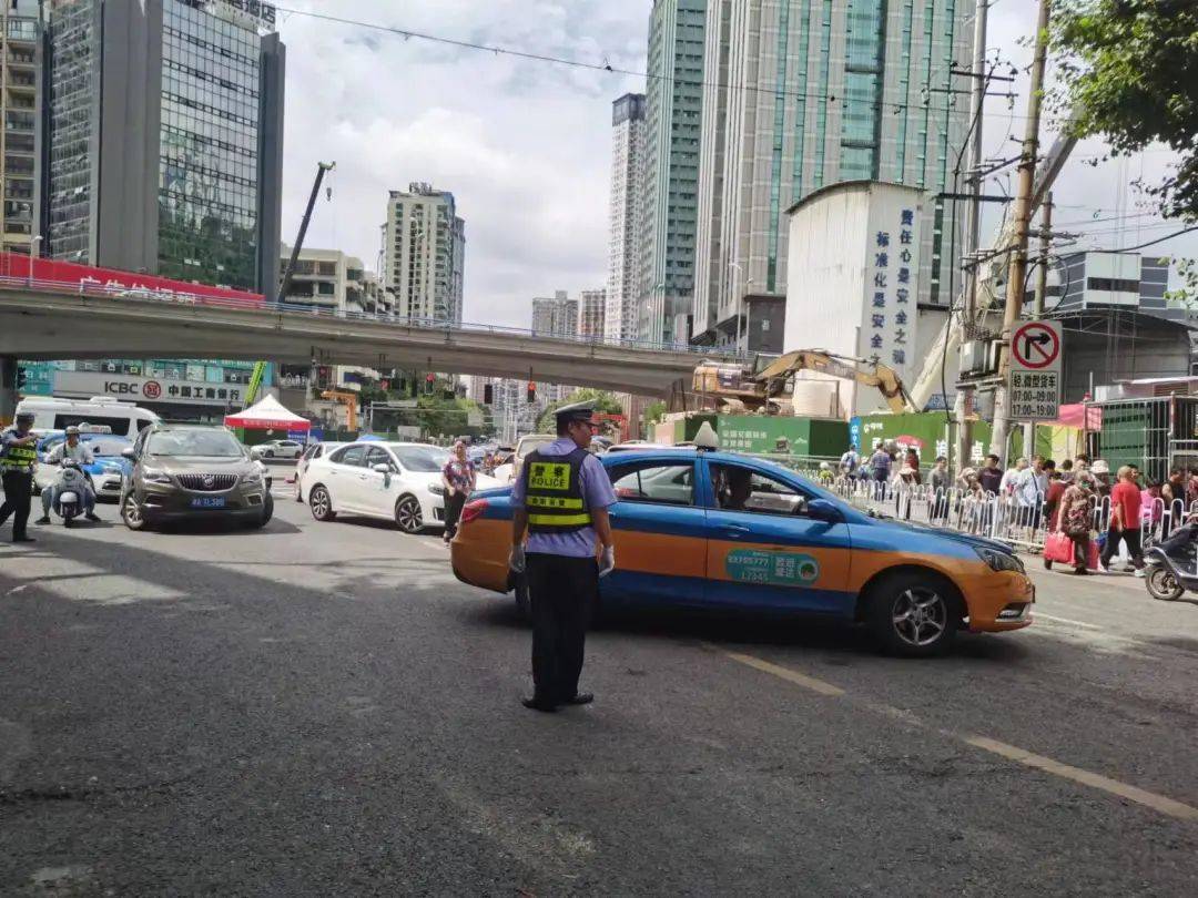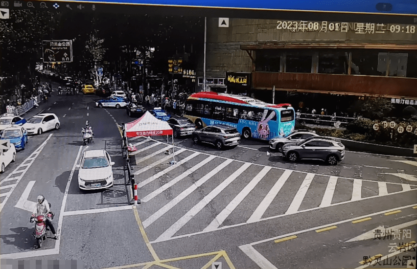 黔灵山公园南大门前,北京路、北京西路(高架桥)、枣山路多条交通主干道交汇,是贵阳交通东西向、南北向重要交通节点,不少公交线路从此经过,加之贵阳轨道交通3号线部分建设工程仍占据部分车道,交通压力较大。暑期旅游高峰的到来,众多车辆、游客在此聚集,对通行造成一定影响。