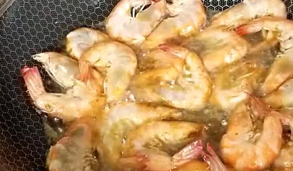 4、在锅里放上一点油,把处理好的大虾放在锅里面给它煎一下,等到煎到虾油起末。