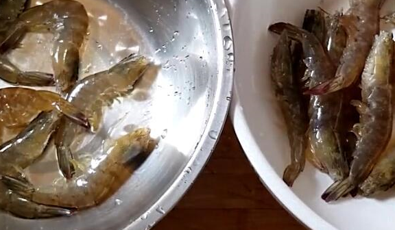 1、我们先把买来的大虾处理一下,然后再给它清洗干净,把它放在盆子里面备用。