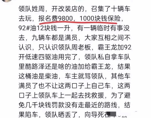 在这次旅游中,每个人都是花了很多钱的,知情人透漏,报名费就9800,加上1000元的保险,一共1万多块钱。本想借助这次旅游能让自己的心情变好,没想到会遇难,真是得不偿失。