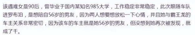就在8月3日,有网友爆料,一个车队组织去罗布泊探险,最终有4人遇难,其中就包含一位正值青春年华的女孩。知情人爆料,她是一位白富美,家里不但有钱,而且学历也很高,毕业于985。