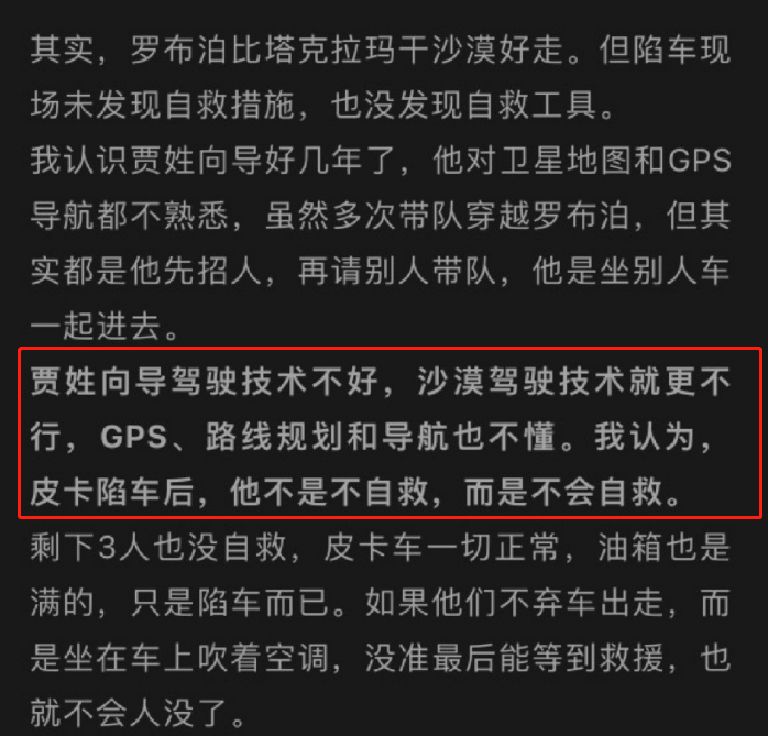 而且他还特别独断,盲目自信,认为自己所走的路线很安全,临近公路,想买什么都能买到,就带了一天的饮用水。因此大家都怀疑,罗布泊女孩以及其他4人遇难,和这位向导的盲目自信有很大关系。